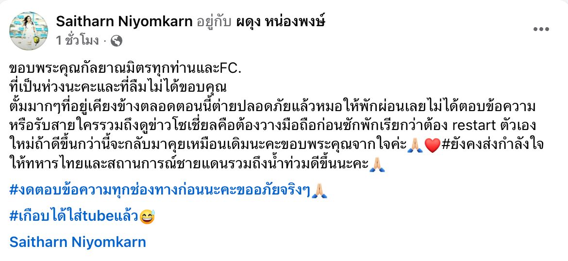 "ขอบพระคุณกัลยาณมิตรทุกท่านและ FC. ที่เป็นห่วงนะคะ และที่ลืมไม่ได้ ขอบคุณตั้มมากๆ ที่อยู่เคียงข้างตลอด ตอนนี้ต่ายปลอดภัยแล้ว หมอให้พักผ่อนเลยไม่ได้ตอบข้อความหรือรับสายใคร