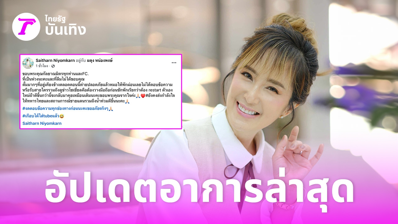 ล่าสุด ต่ายก็ได้เคลื่อนไหวผ่านทางเฟซบุ๊กของตัวเองเพื่ออัปเดตอาการและขอบคุณทุกๆ คนที่ห่วงใย พร้อมทั้งส่งกำลังใจให้ทหารไทยและพี่น้องที่ประสบอุทกภัยว่า
