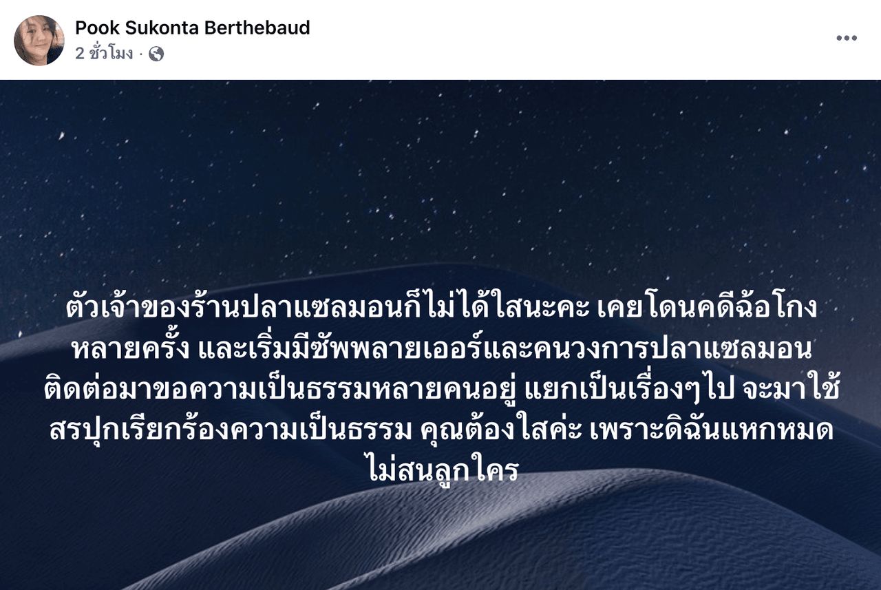 หลังจากที่เพจ Pook Sukonta Berthebaud โพสต์ข้อความดังกล่าวไปได้ไม่นาน ก็มีชาวเน็ตได้ส่งข้อความเข้ามาเตือนว่า เจ้าของร้านปลาแซลมอนนั้นก็มีประวัติคดีฉ้อโกง งานนี้เลยทำให้เพจ Pook Sukonta Berthebaud ต้องออกมาโพสต์ถึงอีกมุมหนึ่งของเจ้าของร้านปลาด้วยเช่นกัน