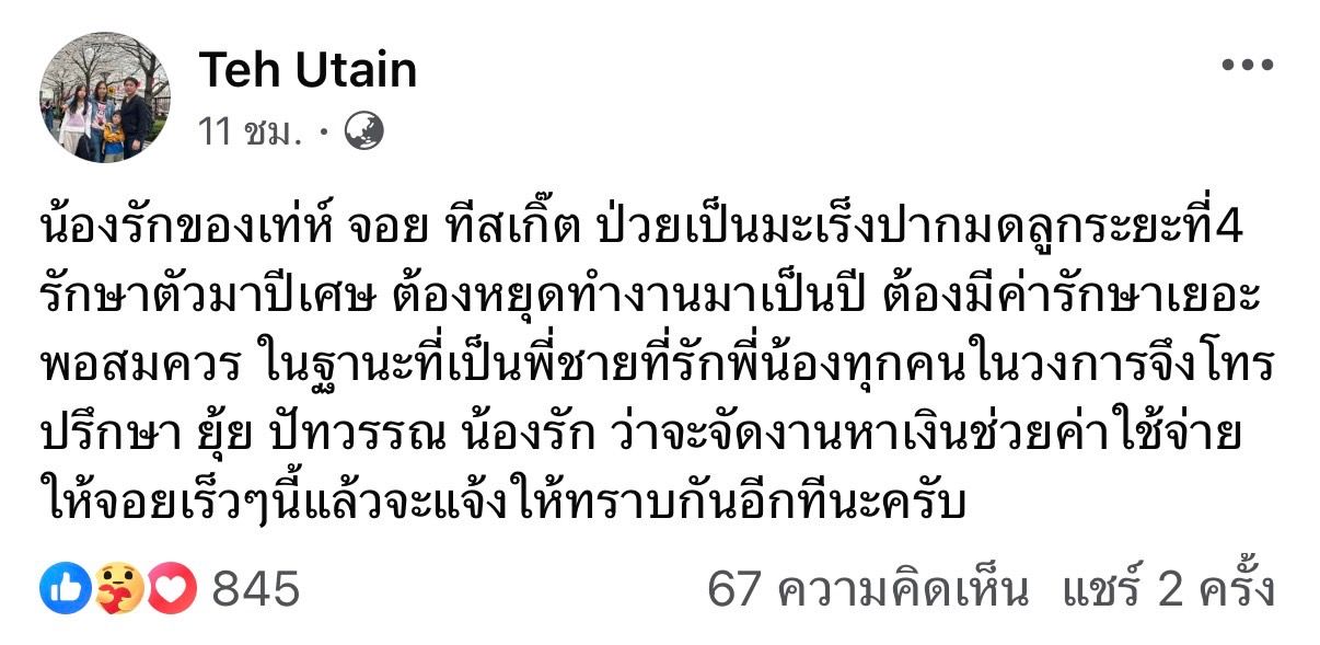 ในฐานะที่เป็นพี่ชายที่รักพี่น้องทุกคนในวงการจึงโทรปรึกษา ยุ้ย ปัทวรรณ น้องรัก ว่าจะจัดงานหาเงินช่วยค่าใช้จ่ายให้จอยเร็วๆ นี้แล้วจะแจ้งให้ทราบกันอีกทีนะครับ"