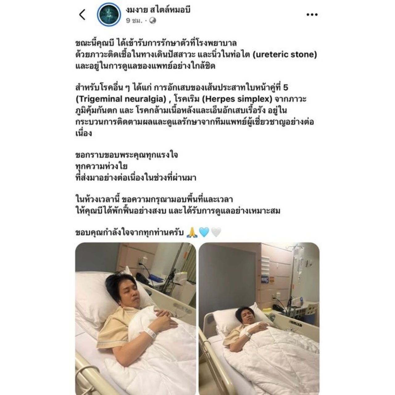 จากนั้นทางเพจ งมงาย สไตล์หมอบี ได้ออกมาเปิดเผยภาพของ หมอบี ขณะเข้ารับการรักษาตัวที่โรงพยาบาล พร้อมกับบอกว่า หมอบี มีภาวะติดเชื้อในทางเดินปัสสาวะ และนิ่วในท่อไต และยังบอกอีกว่า มีภาวะการอักเสบของเส้นประสาทใบหน้าคู่ที่ 5, โรคเริม จากภาวะภูมิคุ้มกันตก และ โรคกล้ามเนื้อหลังและเอ็นอักเสบเรื้อรัง แทรกซ้อนด้วย
