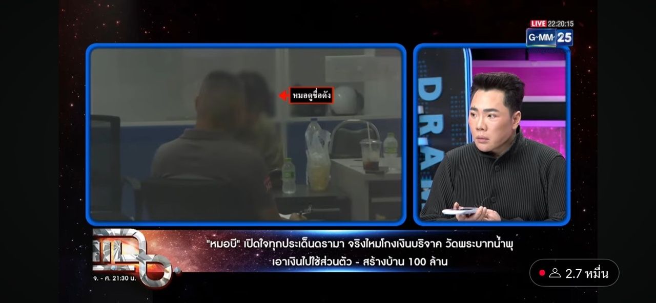 - แต่เมื่อถึงเวลาเข้ารายการ แฉ มดดำ เผยว่า ตอนนี้ ณ เวลา 21.30 น. หมอบี ยังอยู่ที่กองปราบฯ ยังไม่สามารถเดินทางมาที่รายการได้ เพราะอยู่ระหว่างการตรวจสอบ และทางวัดเองก็ยังไม่ได้เข้ามาแจ้งความ เลยยังไม่ได้เป็นคดีความ หมอบียังเป็นผู้บริสุทธิ์ แต่ทางกองปราบฯ รับเรื่องไว้แล้ว ซึ่งวันนี้หมอบีแค่เดินทางมาลงบันทึกประจำวัน
