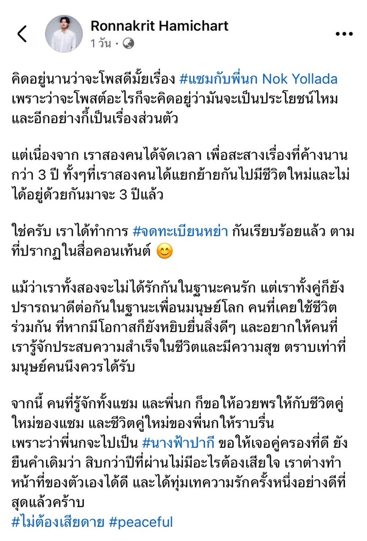 แต่เนื่องจากเราสองคนได้จัดเวลา เพื่อสะสางเรื่องที่ค้างนานกว่า 3 ปี ทั้งๆ ที่เราสองคนได้แยกย้ายกันไปมีชีวิตใหม่และไม่ได้อยู่ด้วยกันมาจะ 3 ปีแล้ว ใช่ครับ เราได้ทำการ #จดทะเบียนหย่า กันเรียบร้อยแล้ว ตามที่ปรากฏในสื่อคอนเทนต์