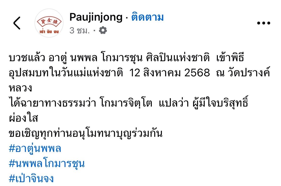 "บวชแล้ว อาตู่ นพพล โกมารชุน ศิลปินแห่งชาติ เข้าพิธีอุปสมบทในวันแม่แห่งชาติ 12 สิงหาคม 2568 ณ วัดปรางค์หลวง ได้ฉายาทางธรรมว่า โกมารจิตฺโต แปลว่า ผู้มีใจบริสุทธิ์ผ่องใส ขอเชิญทุกท่านอนุโมทนาบุญร่วมกัน"