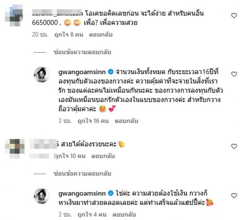 "จำนวนเงินทั้งหมด กับระยะเวลา 16 ปีที่ลงทุนกับตัวเองของกวางค่ะ ความคุ้มค่าที่จะจ่ายในสิ่งที่เรารักของแต่ละคนไม่เหมือนกันนะคะ ของกวางการลงทุนกับตัวเองมันเหมือนบอกรักตัวเองในแบบของกวางค่ะ สำหรับกวางถือว่าคุ้มค่าค่ะ"