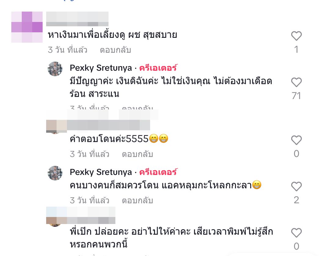 โดยชาวเน็ตคนดังกล่าว ได้เข้าไปคอมเมนต์ในคลิปของ เป็กกี้ ที่ช่องติ๊กต่อกที่เจ้าตัวโพสต์ลง ด้วยข้อความแซะว่า "หาเงินมาเพื่อเลี้ยงดูผู้ชาย สุขสบาย" งานนี้เป็กกี้สวนกลับแบบเจ็บจี๊ดว่า "มีปัญญาค่ะ เงินดิฉันค่ะ ไม่ใช่เงินคุณ ไม่ต้องมาเดือดร้อน สาระแน"
