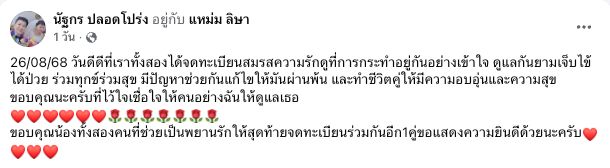 "26/08/68 วันดีดีที่เราทั้งสองได้จดทะเบียนสมรส ความรักดูที่การกระทำอยู่กันอย่างเข้าใจ ดูแลกันยามเจ็บไข้ได้ป่วย ร่วมทุกข์ร่วมสุข มีปัญหาช่วยกันแก้ไขให้มันผ่านพ้น และทำชีวิตคู่ให้มีความอบอุ่นและความสุข ขอบคุณนะครับที่ไว้ใจเชื่อใจให้คนอย่างฉันให้ดูแลเธอ ขอบคุณน้องทั้งสองคนที่ช่วยเป็นพยานรักให้ สุดท้ายจดทะเบียนร่วมกันอีก 1 คู่ ขอแสดงความยินดีด้วยนะครับ"