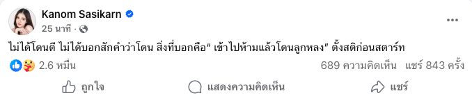 ล่าสุด ขนม ศศิกานต์ อดีตภรรยาของ ครูเต้ย อภิวัฒน์ ก็ได้ออกมาโพสต์ข้อความผ่านทางเฟซบุ๊กของตัวเองถึงเรื่องดังกล่าวโดยมีข้อความว่า "ไม่ได้โดนตี ไม่ได้บอกสักคำว่าโดน สิ่งที่บอกคือ“ เข้าไปห้ามแล้วโดนลูกหลง” ตั้งสติก่อนสตาร์ท"