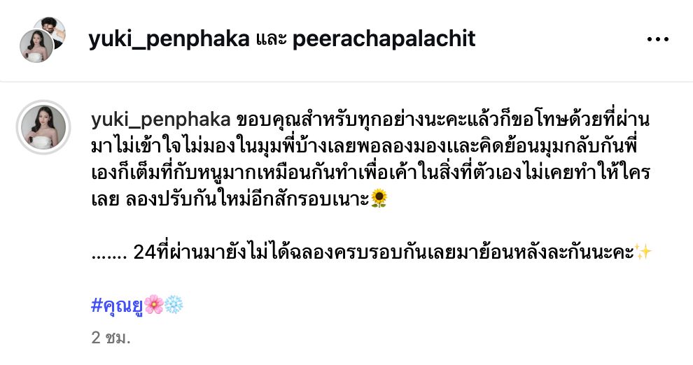 แต่ล่าสุด แฟนๆ ของคู่นี้ดีใจแบบสุดๆ เมื่อ ยูกิ ได้โพสต์ภาพคู่กับ พีพี พร้อมข้อความขอโทษฝ่ายชายกับเรื่องที่เกิดขึ้น พร้อมลองปรับกันใหม่อีกรอบว่า