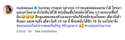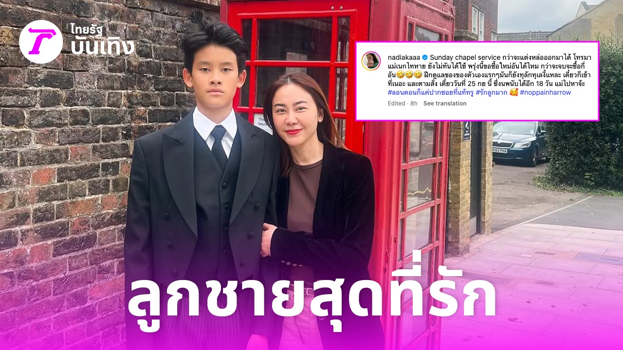 ล่าสุดคุณแม่นาเดียได้เผยเรื่องราวของลูกชายหลังจากที่ต้องไปอยู่ที่อังกฤษให้แฟนๆ ได้ฟังว่า "Sunday chapel service กว่าจะแต่งหล่อออกมาได้ โทรมา แม่เนกไทหาย ยังไม่ทันได้ใช้ พรุ่งนี้ขอซื้อใหม่อันได้ไหม กว่าจะจบจะซื้อกี่อัน ฝึกดูแลของของตัวเองแรกๆ มันก็ยังทุลักทุเลงี้แหละ เดี๋ยวก็เข้าที่เนอะ และตามสั่ง เดี๋ยววันที่ 25 ก.ย. นี้ ซึ่งนพนับได้อีก 18 วัน แม่ไปหาจ้ะ #ลอนดอนก็แค่ปากซอยที่แท้ทรู #รักลูกมาก"