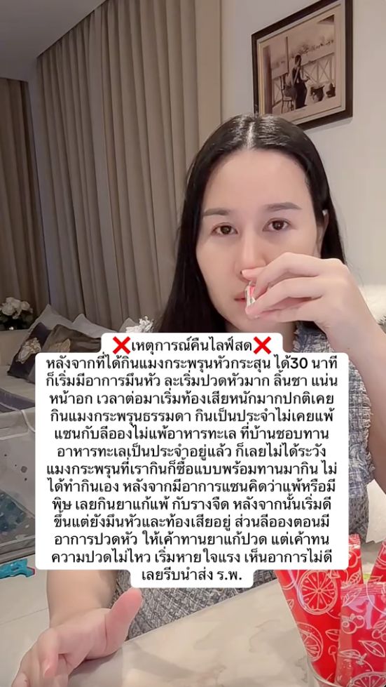 "เหตุการณ์ไลฟ์สด หลังจากที่ได้กินแมงกะพรุนหัวกระสุน ได้ 30 นาที ก็เริ่มมีอาการมึนหัว ละเริ่มปวดหัวมาก ลิ้นชา แน่นหน้าอก เวลาต่อมาเริ่มท้องเสียหนักมาก ปกติเคยกินแมงกะพรุนธรรมดา กินเป็นประจำไม่เคยแพ้