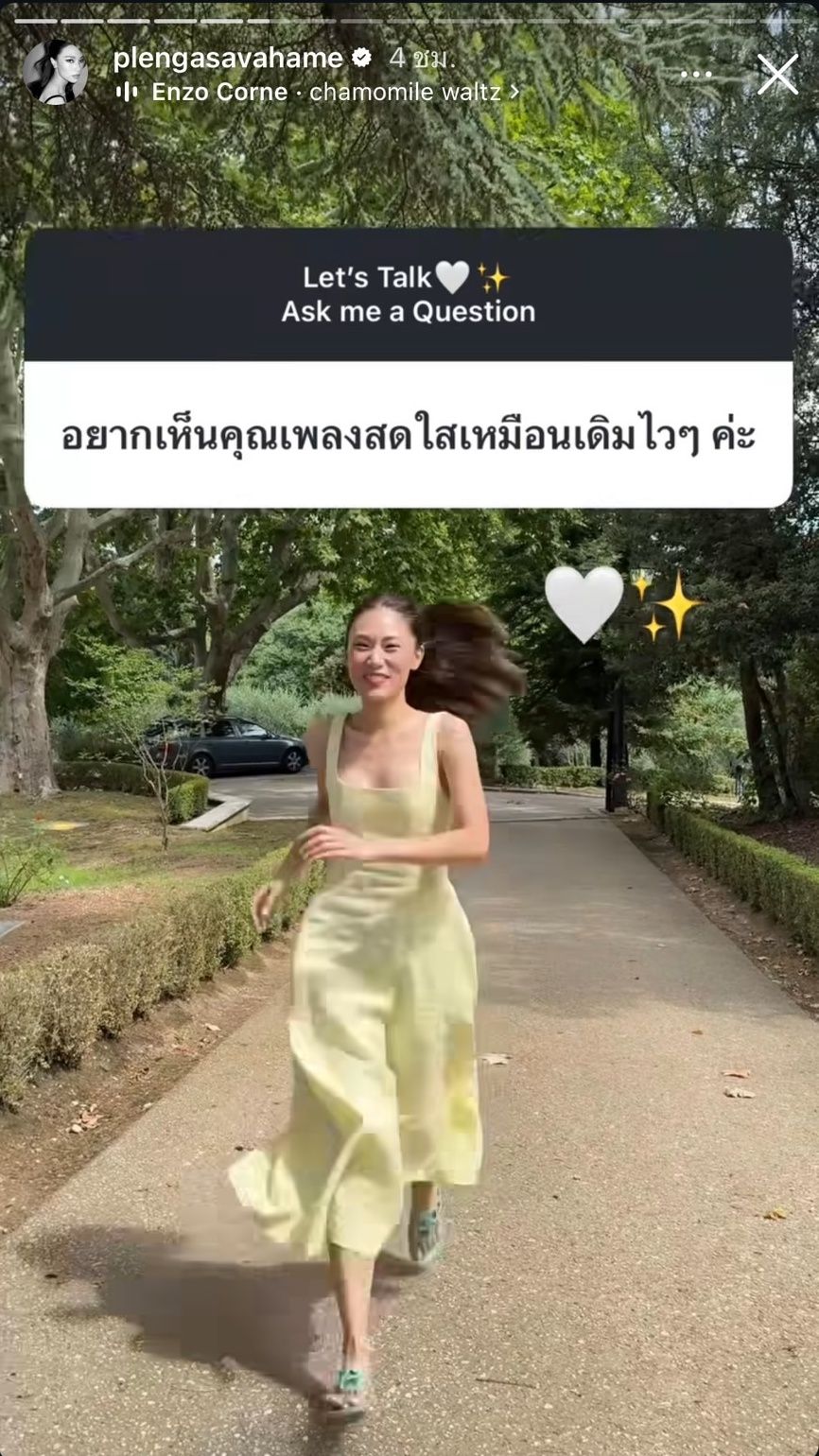 และอีกคำถามที่เพลงเลือกมาตอบคือ "อยากเห็นคุณเพลงสดใสเหมือนเดิมไวๆ ค่ะ" ซึ่งเพลงไม่ได้ตอบคำถามด้วยตัวอักษรแต่ลงคลิปตัวเองวิ่งพร้อมรอยยิ้มที่สดใสแทนคำตอบอีกด้วย