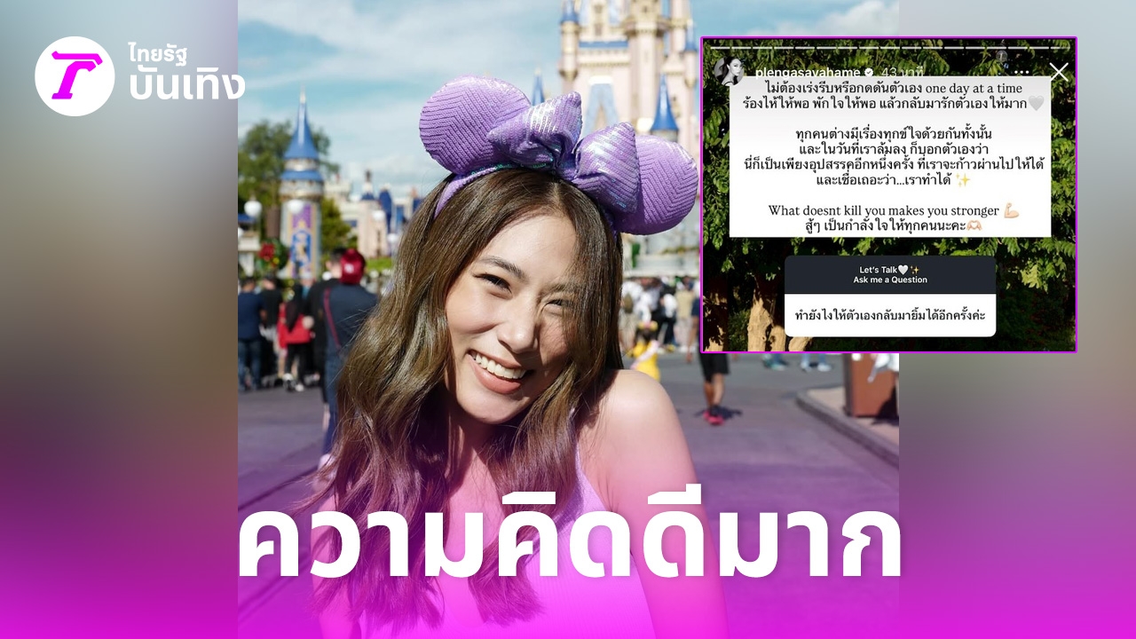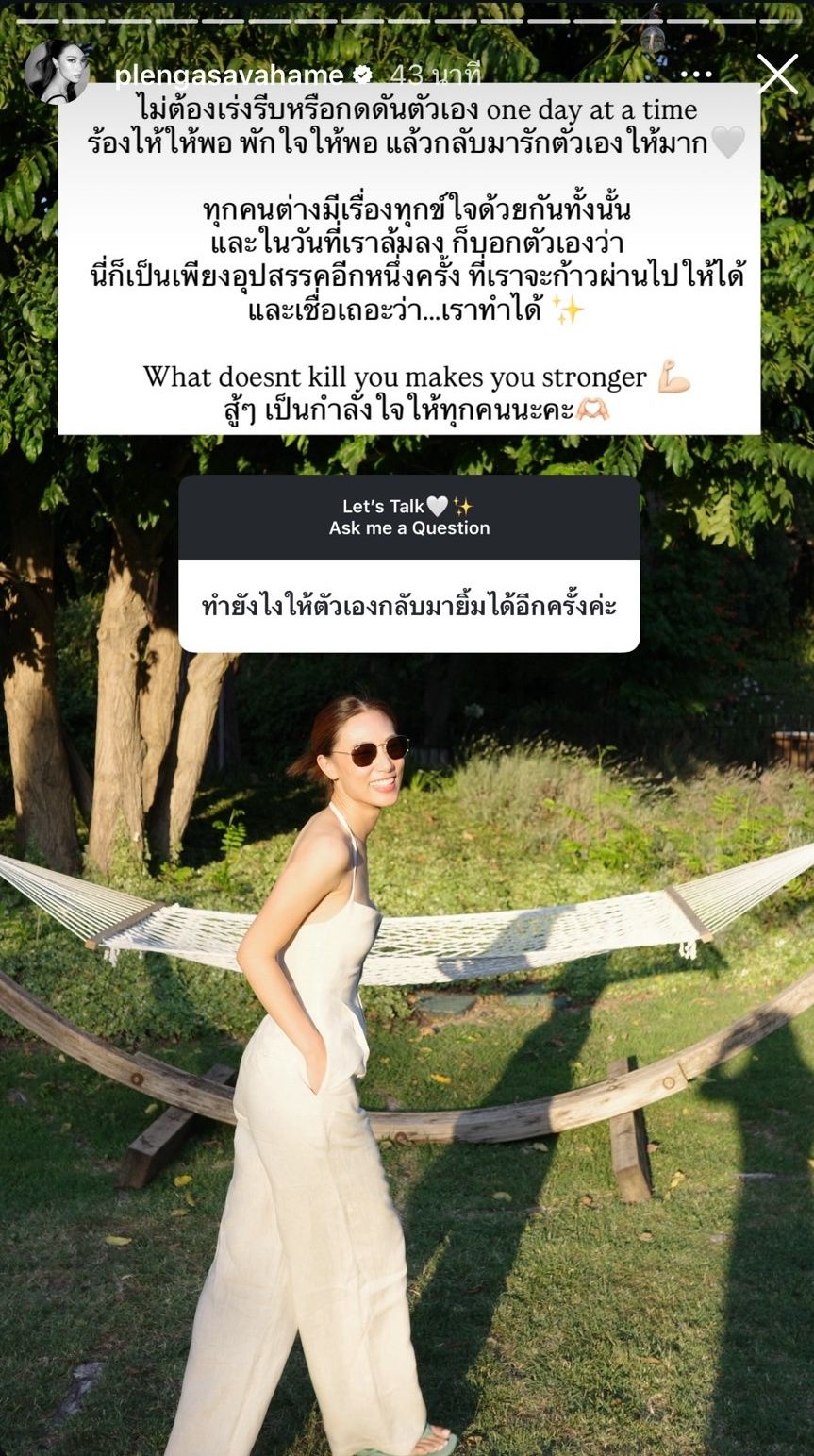 "ไม่ต้องเร่งรีบหรือกดดันตัวเอง one day at a time ร้องไห้ให้พอ พักใจให้พอ แล้วกลับมารักตัวเองให้มาก ทุกคนต่างมีเรื่องทุกข์ใจด้วยกันทั้งนั้น และในวันที่เราล้มลง ก็บอกตัวเองว่า นี่ก็เป็นเพียงอุปสรรคอีกหนึ่งครั้ง ที่เราจะก้าวผ่านไปให้ได้ และเชื่อเถอะว่า...เราทำได้ What doesnt kill you makes you stronger สู้ๆ เป็นกำลังใจให้ทุกคนนะคะ"