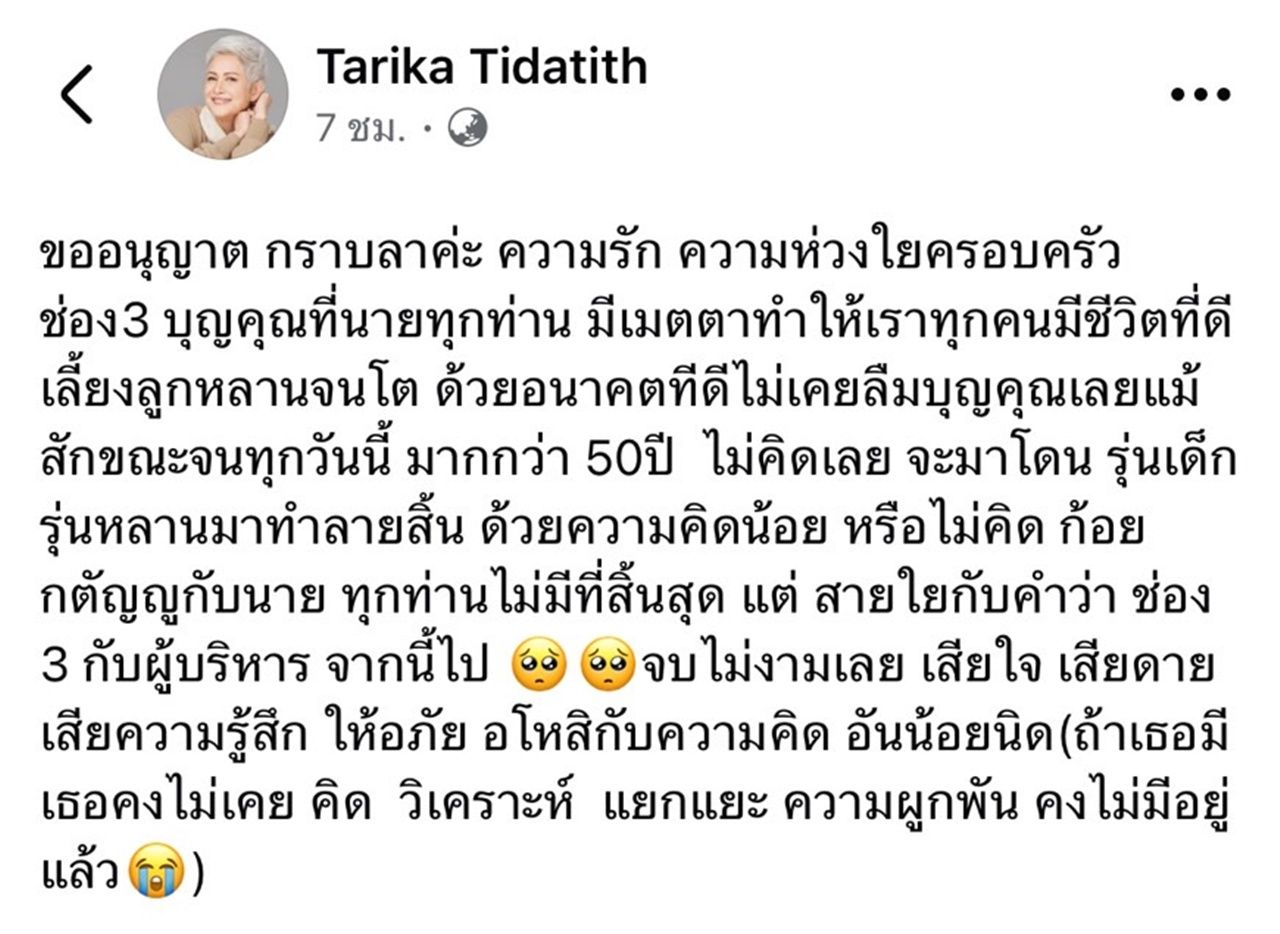 "ขออนุญาต กราบลาค่ะ ความรัก ความห่วงใยครอบครัว ช่อง 3 บุญคุณที่นายทุกท่าน มีเมตตาทำให้เราทุกคนมีชีวิตที่ดีเลี้ยงลูกหลานจนโต ด้วยอนาคตที่ดีไม่เคยลืมบุญคุณเลยแม้สักขณะจนทุกวันนี้ มากกว่า 50 ปี ไม่คิดเลย จะมาโดน รุ่นลูกรุ่นหลานมาทำลายสิ้น ด้วยความคิดน้อย หรือไม่คิด ก้อยกตัญญูกับนาย ทุกท่านไม่มีที่สิ้นสุด แต่ สายใยกับคำว่า ช่อง 3 กับผู้บริหาร จากนี้ไป จบไม่งามเลย เสียใจ เสียดาย เสียความรู้สึก ให้อภัย อโหสิกับความคิด อันน้อยนิด(ถ้าเธอมี เธอคงไม่เคย คิด วิเคราะห์ แยกแยะ ความผูกพัน คงไม่มีอยู่แล้ว)"