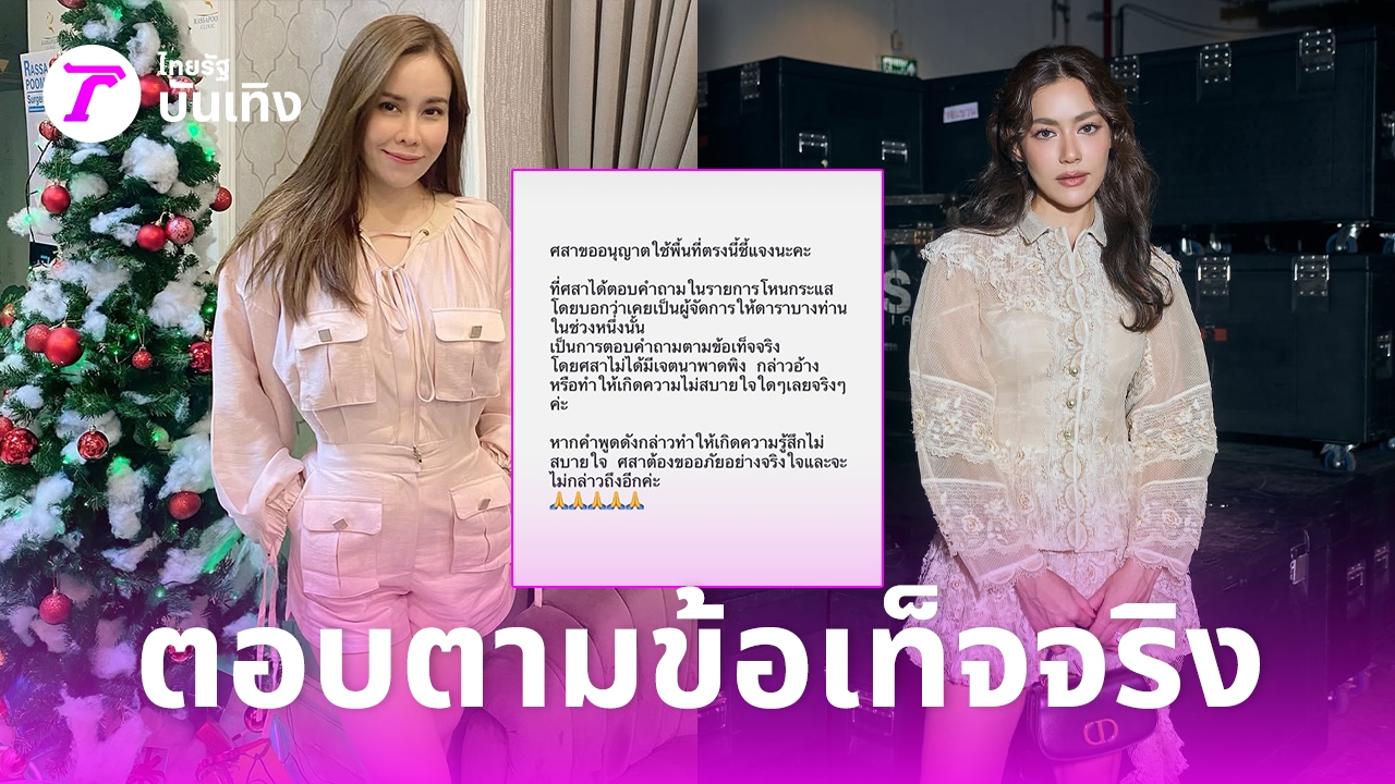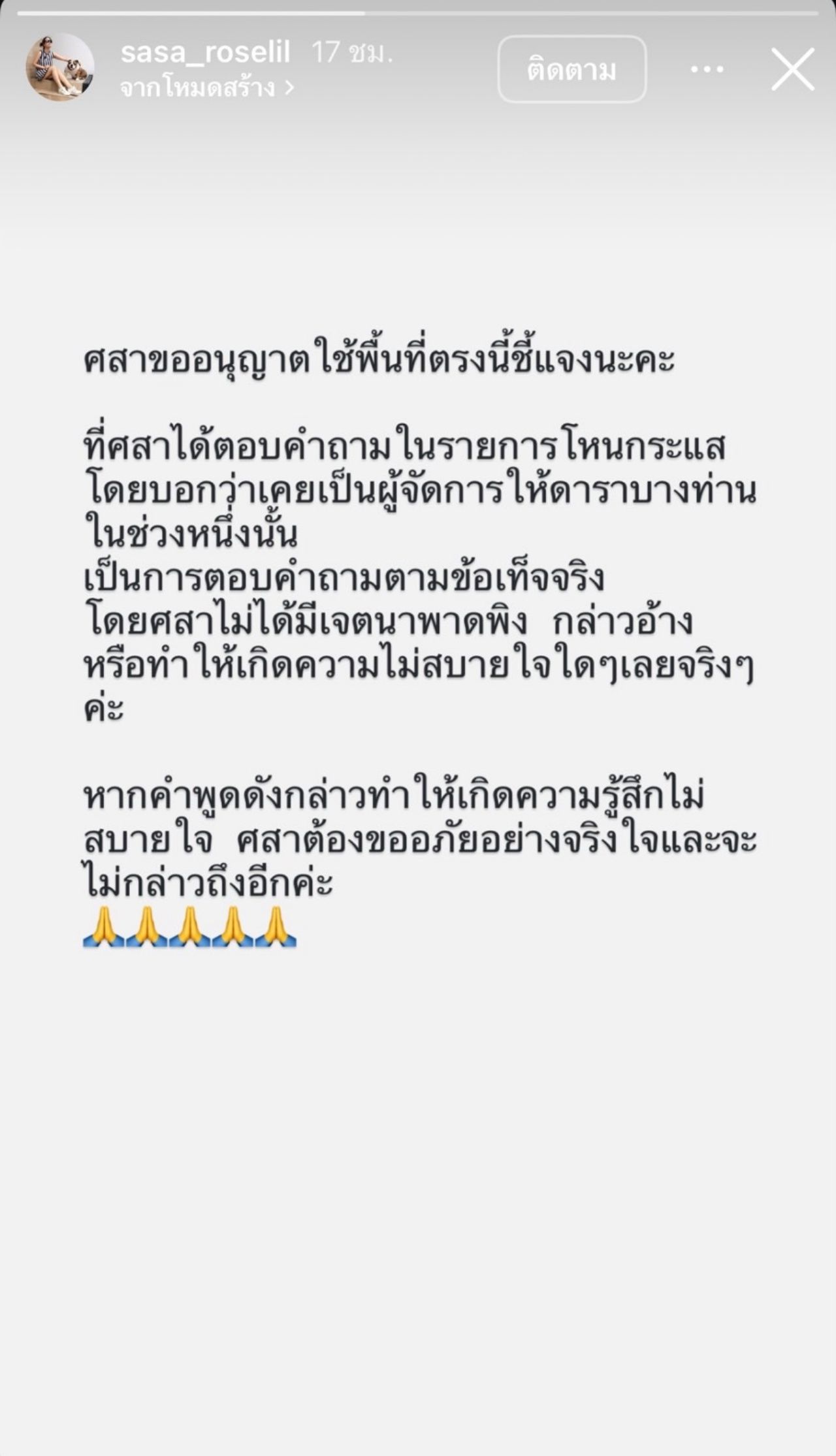 "ศสาขออนุญาตใช้พื้นที่ตรงนี้ชี้แจงนะคะ ที่ศสาได้ตอบคำถามในรายการโหนกระแส โดยบอกว่าเคยเป็นผู้จัดการให้ดาราบางท่านในช่วงหนึ่งนั้นเป็นการตอบคำถามตามข้อเท็จจริง โดยศสาไม่ได้มีเจตนาพาดพิง กล่าวอ้าง หรือทำให้เกิดความไม่สบายใจใดๆเลยจริงๆ หากคำพูดดังกล่าวทำให้เกิดความรู้สึกไม่สบายใจ ศสาต้องขออภัยอย่างจริงใจและจะไม่กล่าวถึงอีกค่ะ"