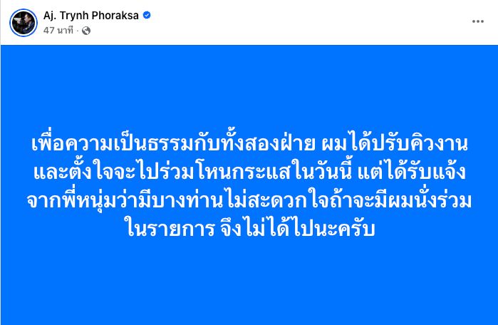 "เพื่อความเป็นธรรมกับทั้งสองฝ่าย ผมได้ปรับคิวงานและตั้งใจจะไปร่วมโหนกระแสในวันนี้ แต่ได้รับแจ้งจากพี่หนุ่มว่ามีบางท่านไม่สะดวกใจถ้าจะมีผมนั่งร่วมในรายการ จึงไม่ได้ไปนะครับ"