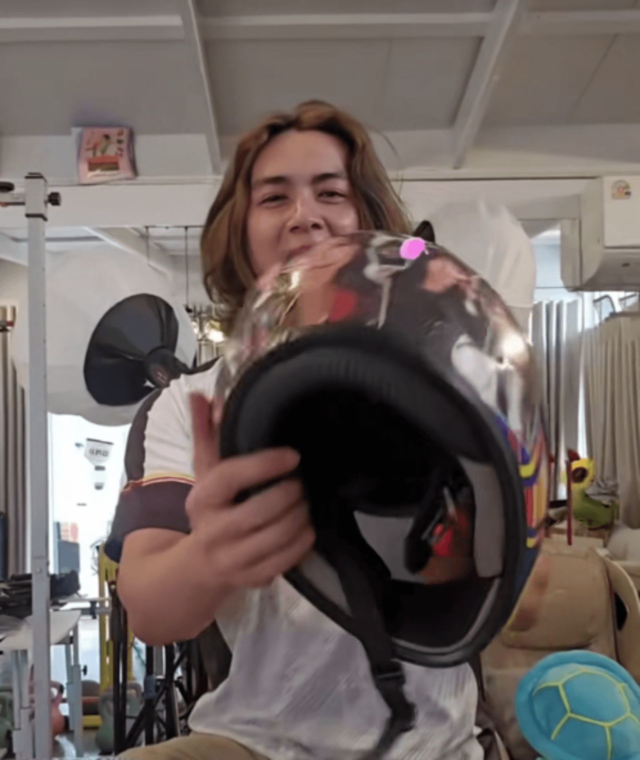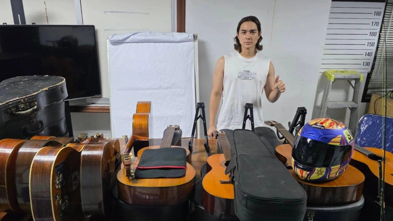 "วันนั้นได้ไปบุกจับโจรเอง เพราะรำคาญตำรวจนะครับ เขาไม่ทำงานกันจริงๆ เราก็เลยออกไปกันเองเลยตอนดึกมากๆ ก็กล้าๆ กลัวๆ หน่อย ไปกันเองเลยตอนดึก ก็ไปดักมา 2-3 เดือนได้แล้ว พอเข้าไปดักจับก็ได้กีตาร์ ไวโอลิน แล้วก็เจอซองปืน แต่มันไม่ยอมรับ ก็ให้ตำรวจเข้ามาดูต่อ แต่เขาไม่ได้ทำอะไรต่อ ปล่อยมันไป แต่มันเป็นคนเอาปืนผมไปนั่นแหละ ก็เลยได้หมวกกันน็อกใบนี้คืนมา"