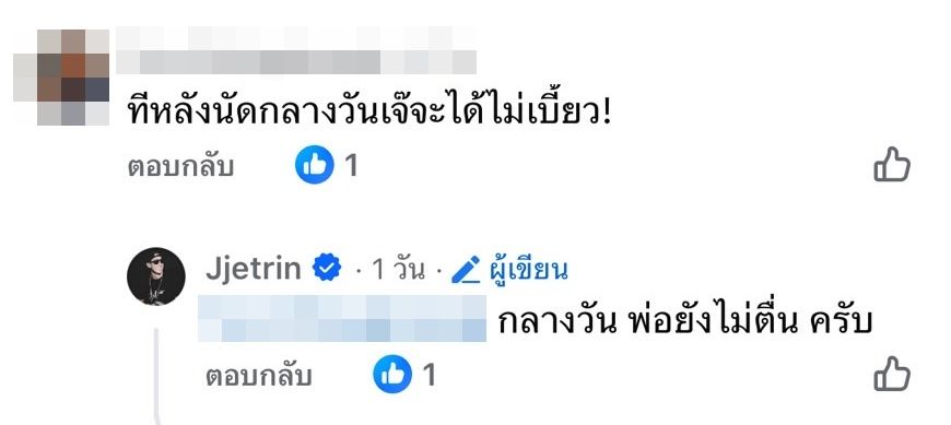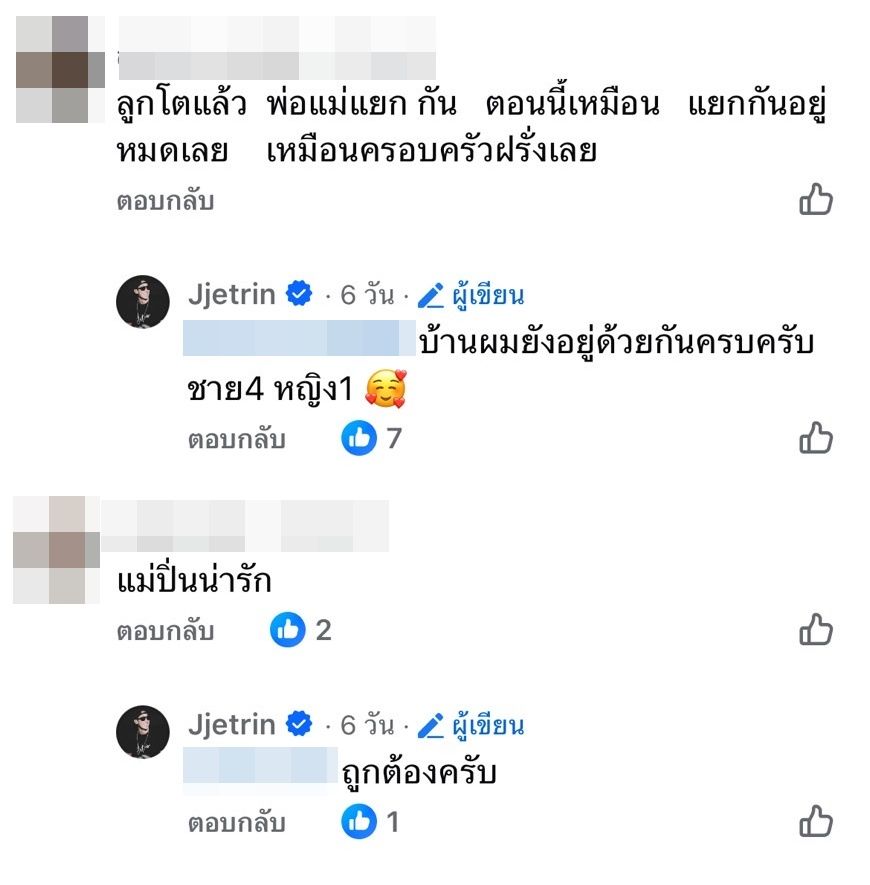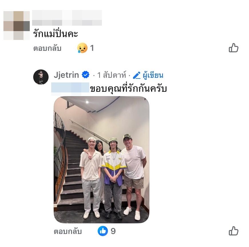 และนอกจากนี้ เจ ยังได้ตอบกลับในหลายๆ คอมเมนต์ที่เข้ามาส่งกำลังใจ และชื่นชมในความน่ารักของลูกๆ ทั้ง 3 คน รวมถึงพ่อเจกับแม่ปิ่นอีกด้วย