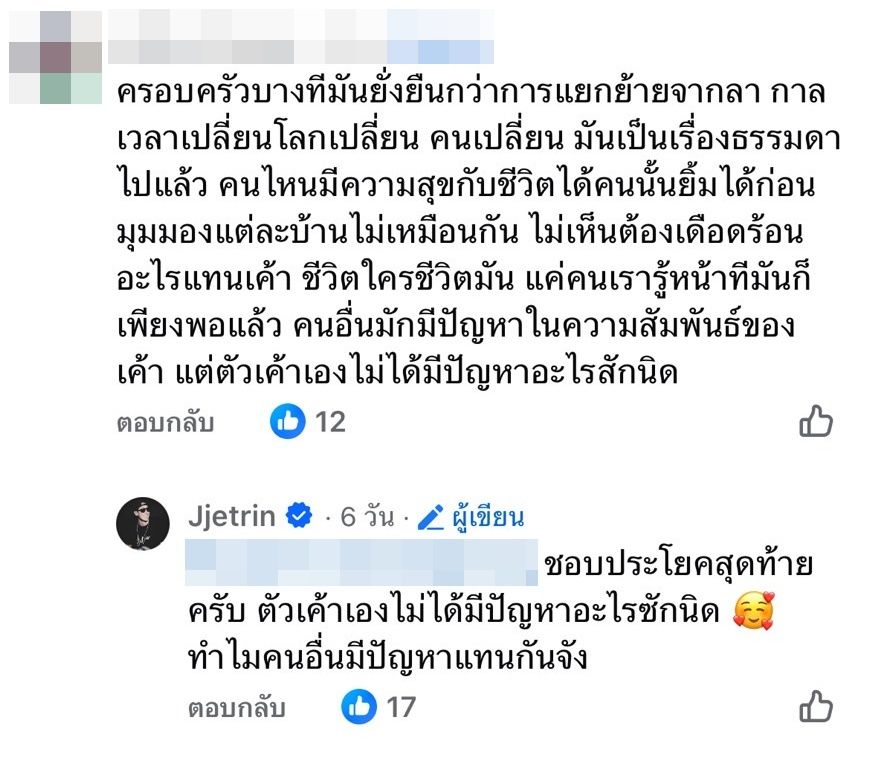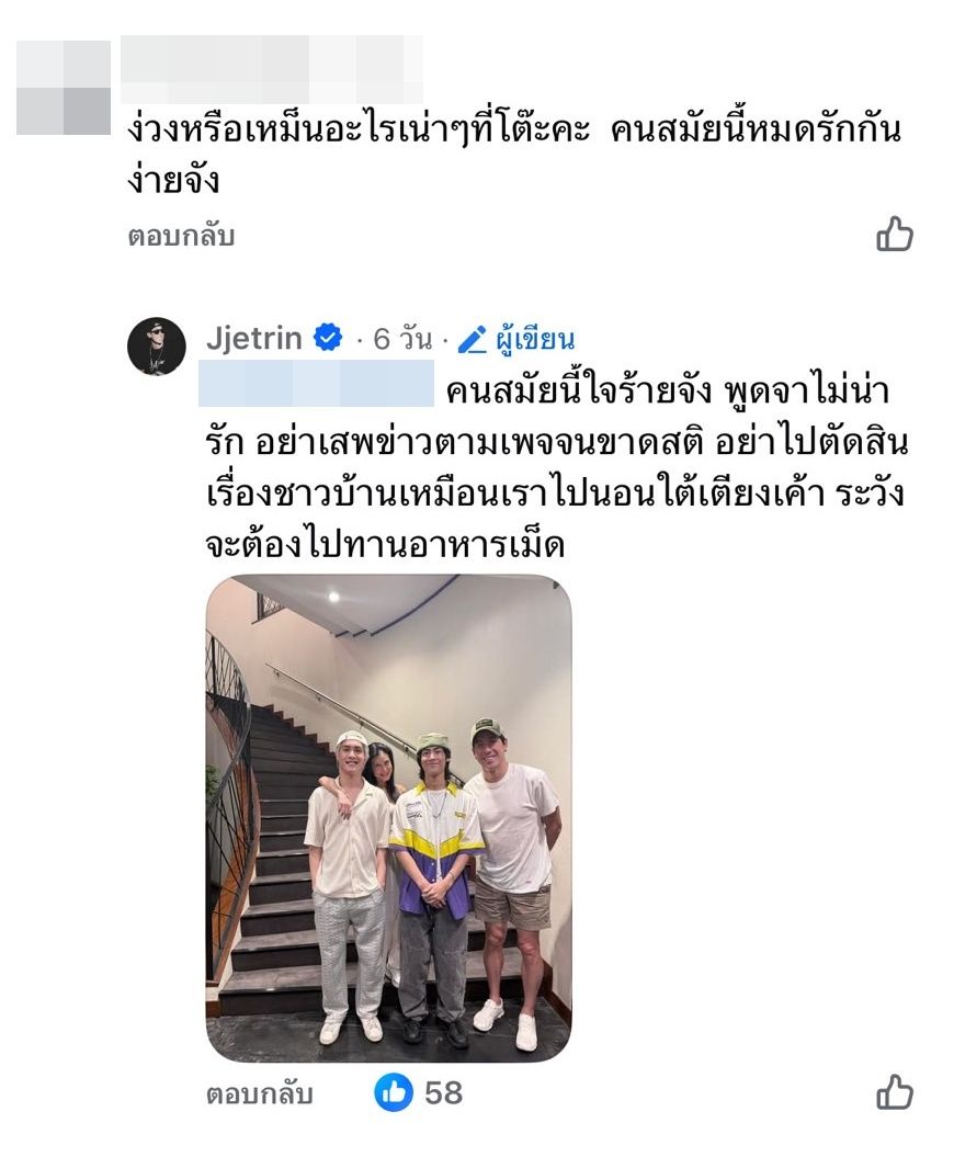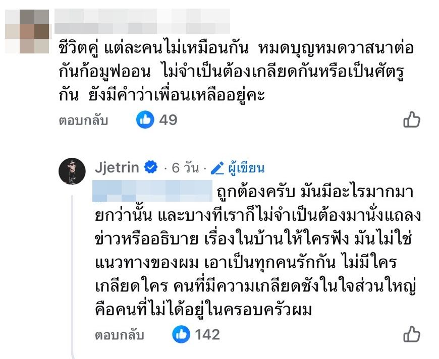 "ง่วงหรือเหม็นอะไรเน่าๆที่โต๊ะคะ คนสมัยนี้หมดรักกันง่ายจัง" ด้าน เจ ก็ได้ตอบกลับไปว่า "คนสมัยนี้ใจร้ายจัง พูดจาไม่น่ารัก อย่าเสพข่าวตามเพจจนขาดสติ อย่าไปตัดสินเรื่องชาวบ้านเหมือนเราไปนอนใต้เตียงเค้า ระวังจะต้องไปทานอาหารเม็ด" พร้อมกับโพสต์ภาพที่มีพ่อเจ แม่ปิ่น และลูกชายอยู่ในเฟรมเดียวกัน