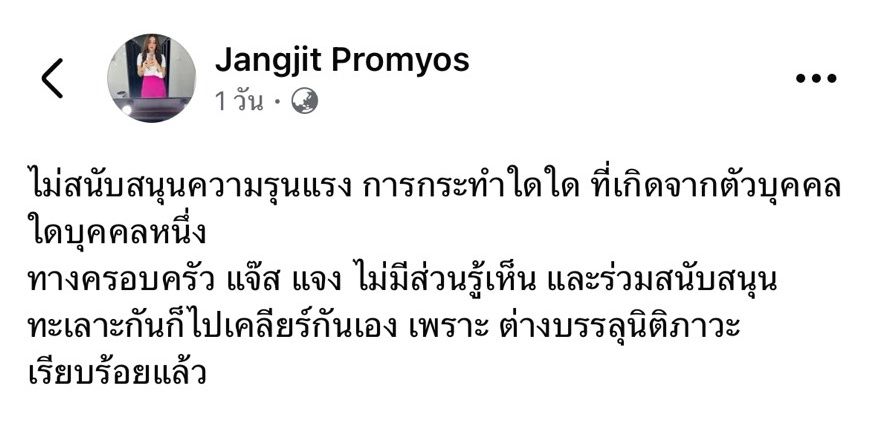 ล่าสุด แจง ปุณณาสา ภรรยาของ แจ๊ส ชวนชื่น ก็ได้ออกมาโพสต์ข้อความผ่านเฟซบุ๊กว่า "ไม่สนับสนุนความรุนแรง การกระทำใดๆ ที่เกิดจากตัวบุคคล ใดบุคคลหนึ่ง ทางครอบครัว แจ๊ส แจง ไม่มีส่วนรู้เห็น และร่วมสนับสนุน ทะเลาะกันก็ไปเคลียร์กันเอง เพราะ ต่างบรรลุนิติภาวะ เรียบร้อยแล้ว"