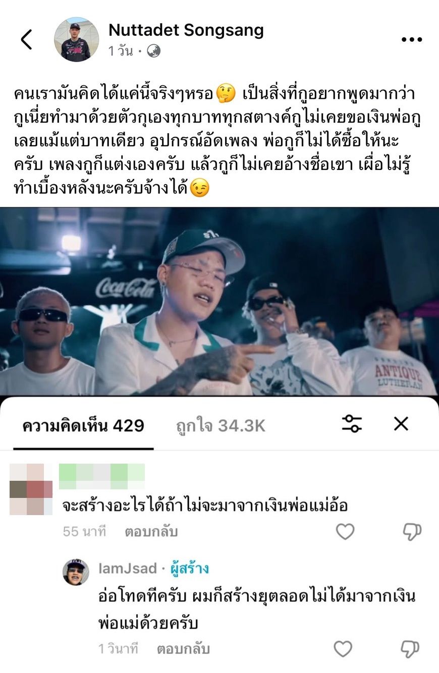 "คนเรามันคิดได้แค่นี้จริงๆหรอ เป็นสิ่งที่กูอยากพูดมากว่ากูเนี่ยทำมาด้วยตัวกุเองทุกบาททุกสตางค์กูไม่เคยขอเงินพ่อกูเลยแม้แต่บาทเดียว อุปกรณ์อัดเพลง พ่อกูก็ไม่ได้ซื้อให้นะครับ เพลงกูก็แต่งเองครับ แล้วกูก็ไม่เคยอ้างชื่อเขา เผื่อไม่รู้ทำเบื้องหลังนะครับจ้างได้"
