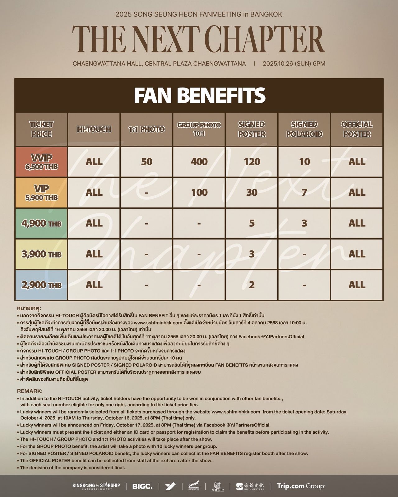 ผู้จัดฯ อย่าง YJ PARTNERS ยืนยันว่างานนี้จะเต็มไปด้วยกิจกรรมพิเศษและโชว์ที่ซงซึงฮอนเตรียมมาเพื่อแฟน ๆ ชาวไทยโดยเฉพาะ เพื่อให้ค่ำคืนวันที่ 26 ตุลาคม นี้ เป็นอีกหนึ่งความทรงจำที่น่าประทับใจและน่าจดจำที่สุด เปิดจำหน่ายบัตรแล้ว ทาง https://www.sshfminbkk.com บัตรราคา: 6,500 (VVIP) / 5,900 (VIP) / 4,900 / 3,900 / 2,900 บาท ที่มาพร้อมสิทธิพิเศษสุดใกล้ชิดอย่างไฮทัชทุกราคาบัตร!!! แฟนๆ ที่คิดถึง "โอปป้า" คนนี้ ห้ามพลาดโอกาสที่จะได้ใกล้ชิดและสร้างความทรงจำดีๆ ร่วมกันนะ