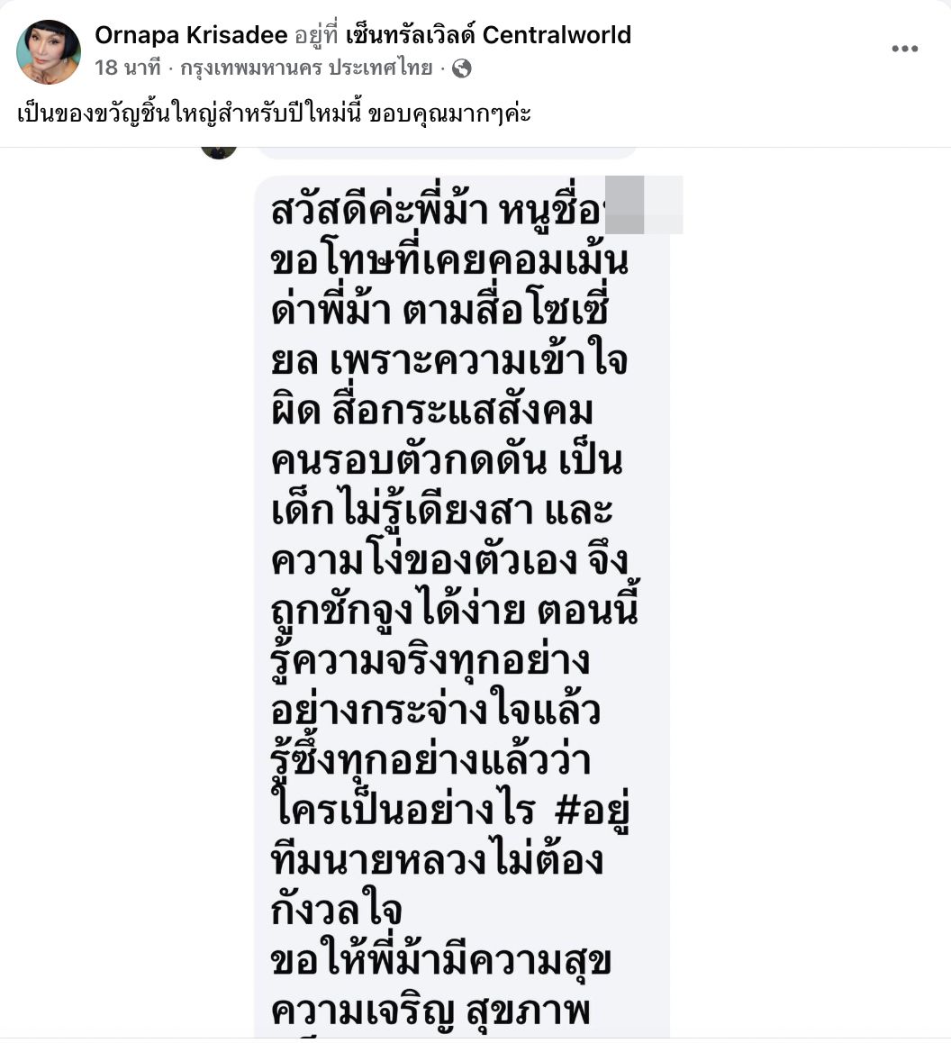 เป็นเรื่องราวดีๆ ต้อนรับปีใหม่ เมื่อ ม้า อรนภา ได้แคปข้อความของชาวเน็ตรายหนึ่ง ที่เขียนข้อความมาขอโทษ นำมาโพสต์ลงในโซเชียลของตัวเอง พร้อมแคปชันว่า "เป็นของขวัญชิ้นใหญ่สำหรับปีใหม่นี้ ขอบคุณมากๆ ค่ะ" ซึ่งข้อความที่ชาวเน็ตคนนั้นเขียนมา มีข้อความดังนี้