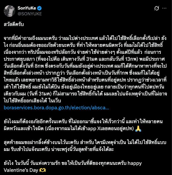 “สน ยุกต์” ออกมาชี้แจงด่วนผ่านโซเชียลมีเดีย หลังถูกถามถึงการไปใช้สิทธิ์เลือกตั้งเมื่อวันที่ 8 กุมภาพันธ์ที่ผ่านมา โดยเจ้าตัวเผยว่ารู้สึกเสียใจที่ทำให้หลายคนผิดหวัง แต่ยืนยันว่ามีความตั้งใจจะไปใช้สิทธิ์ ทว่าติดเงื่อนไขเรื่องเวลาเนื่องจากจองทริปต่างประเทศไว้ข้ามปี (31 ม.ค. - 13 ก.พ.) ก่อนมีการประกาศยุบสภา