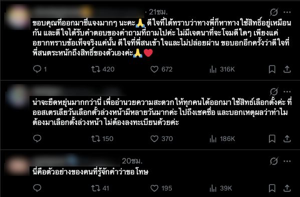 หนุ่มสนระบุว่า ได้พยายามหาทางออกทุกวิถีทาง ทั้งการเลือกตั้งล่วงหน้าในไทยและการเลือกตั้งนอกราชอาณาจักร แต่เนื่องจากวันเดินทางคาบเกี่ยวพอดี ทำให้ไม่สามารถลงทะเบียนได้ตามกฎเกณฑ์ อย่างไรก็ตาม เจ้าตัวได้ดำเนินการแจ้งเหตุจำเป็นต่อ กกต. ผ่านทางเว็บไซต์ boraservices.bora.dopa.go.th เป็นที่เรียบร้อย พร้อมกันนี้ยังเชิญชวนให้ประชาชนที่มีเหตุจำเป็นเหมือนตนเอง รีบแจ้งเหตุภายในระยะเวลาที่กำหนดเพื่อไม่ให้เสียสิทธิ์ในอนาคต