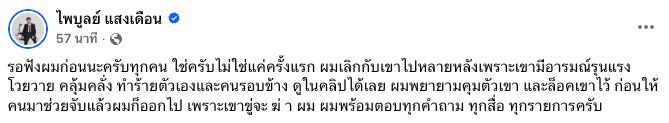 หลังจากที่เพจ โรสเมจิกสกิน โพสต์ออกไป “ครูไพบูลย์” รีบแชร์พร้อมแก้ต่างอีกด้วยว่า รอฟังผมก่อนนะครับทุกคน ใช่ครับไม่ใช่แค่ครั้งแรก ผมเลิกกับเขาไปหลายครั้งเพราะเขามีอารมณ์รุนแรง โวยวาย คลุ้มคลั่ง ทำร้ายตัวเองและคนรอบข้าง ดูในคลิปได้เลย ผมพยายามคุมตัวเขา และล็อกเขาไว้ ก่อนให้คนมาช่วยจับแล้วผมก็ออกไป เพราะเขาขู่จะ x่า ผม ผมพร้อมตอบทุกคำถาม ทุกสื่อ ทุกรายการครับ