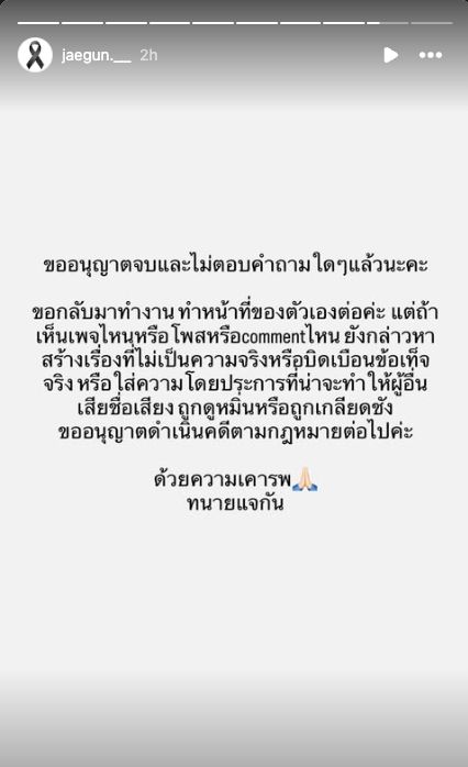 “ขออนุญาตจบและไม่ตอบคำถามใดๆ แล้วนะคะ ขอกลับมาทำงาน ทำหน้าที่ของตัวเองต่อค่ะ แต่ถ้าเห็นเพจไหนหรือโพสต์หรือ comment ไหน ยังกล่าวหา สร้างเรื่องที่ไม่เป็นความจริงหรือบิดเบือน ข้อเท็จจริงหรือใส่ความโดยประการที่น่าจะทำให้ผู้อื่นเสียชื่อเสียง ถูกดูหมิ่นหรือถูกเกลียดชัง ขออนุญาตดำเนินคดีตามกฎหมายต่อไปค่ะ