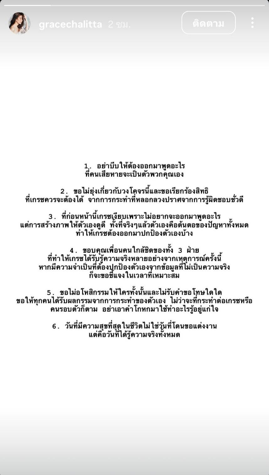 ล่าสุด เกรซ ชลิตา ก็ได้โพสต์ไอจีสตอรี่ครั้งแรกหลังเกิดประเด็นดังกล่าว โดยมีเนื้อหาดังนี้