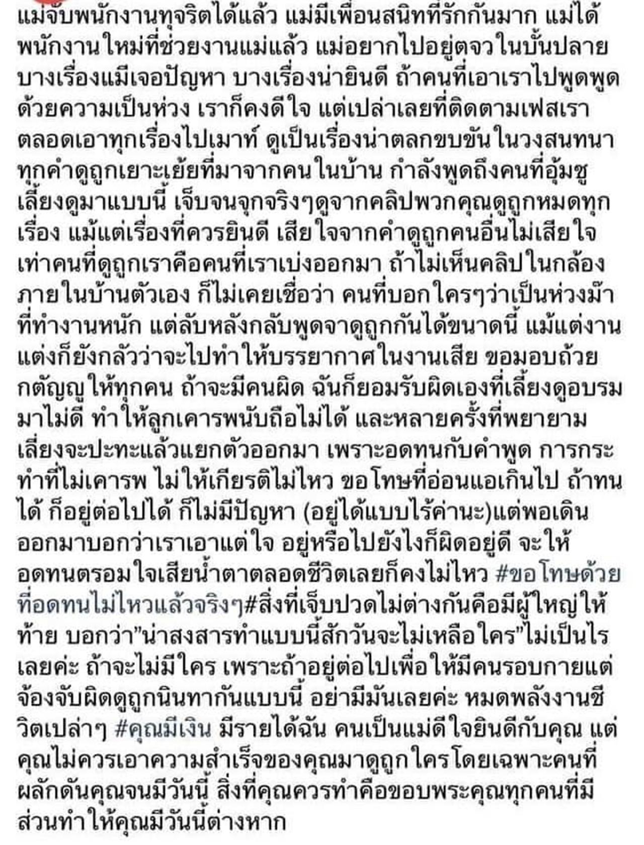 #สิ่งที่เจ็บปวดไม่ต่างกันคือมีผู้ใหญ่ให้ท้าย บอกว่า ‘น่าสงสารทำแบบนี้สักวันจะไม่เหลือใคร’ ไม่เป็นไรเลยค่ะ ถ้าจะไม่มีใคร เพราะถ้าอยู่ต่อไปเพื่อให้มีคนรอบกายแต่จ้องจับผิดดูถูกนินทากันแบบนี้ อย่ามีมันเลยค่ะ หมดพลังงานชีวิตเปล่าๆ #คุณมีเงิน มีรายได้ฉัน คนเป็นแม่ดีใจยินดีกับคุณ แต่คุณไม่ควรเอาความสำเร็จของคุณมาดูถูกใคร โดยเฉพาะคนที่ผลักดันคุณจนมีวันนี้ สิ่งที่คุณควรทำคือขอบพระคุณทุกคนที่มีส่วนทำให้คุณมีวันนี้ต่างหาก"