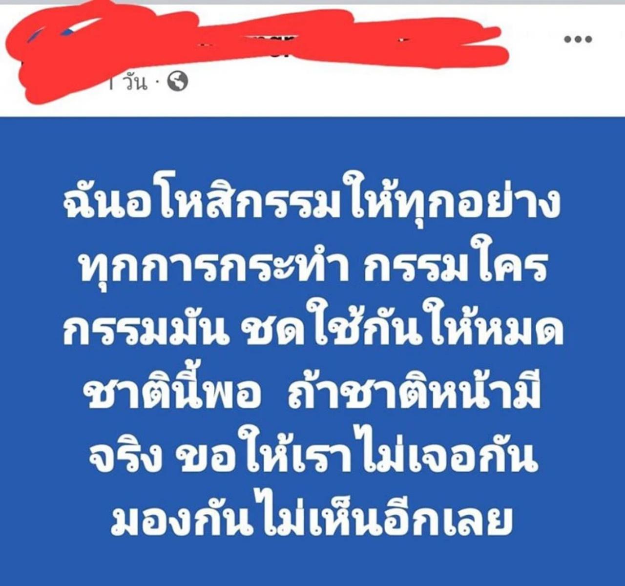 ก่อนจะโพสต์ต่ออีกหลายๆ โพสต์ว่า "ฉันอโหสิกรรมให้ทุกอย่าง ทุกการกระทำ กรรมใคร กรรมมัน ชดใช้กันให้หมดชาตินี้พอ ถ้าชาติหน้ามีจริง ขอให้เราไม่เจอกัน มองกันไม่เห็นอีกเลย"