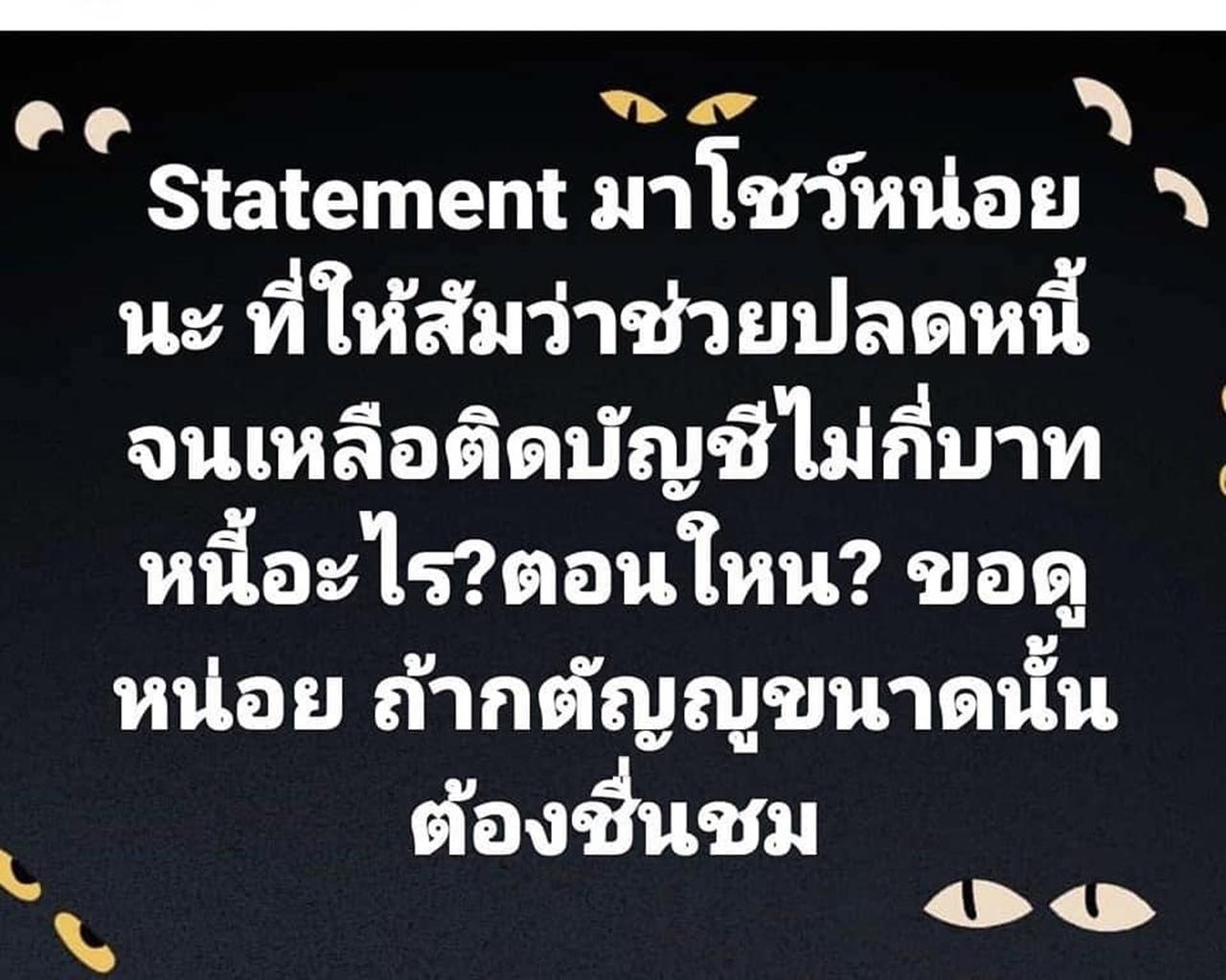 "Statement มาโชว์หน่อยนะ ที่ให้สัมฯ ว่าช่วยปลดหนี้จนเหลือติดบัญชีไม่กี่บาท หนี้อะไร? ตอนไหน? ขอดูหน่อย ถ้ากตัญญูขนาดนั้นต้องชื่นชม"