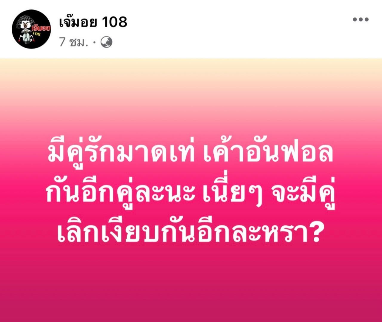 โดย เพจเจ๊มอย108 หย่อนคำใบ้ระบุข้อความเอาไว้ว่า “มีคู่รักมาดเท่ เค้าอันฟอลกันอีกคู่ละนะ เนี่ยๆ จะมีคู่เลิกเงียบกันอีกละหรา?” ทำเอาชาวเน็ตแห่คอมเมนต์กันสนั่น พร้อมกับทายกันยกใหญ่ว่าเป็นคู่รักคู่ไหนเอาไว้มากมายว่า