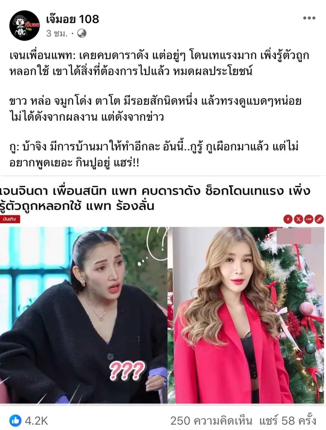 โดยในเพจ เจ๊มอย 108 ได้โพสต์ภาพข่าวพร้อมทั้งเขียนข้อความเล่าว่า “เจนเพื่อนแพท : เคยคบดาราดัง แต่อยู่ๆ โดนเทแรงมาก เพิ่งรู้ตัวถูกหลอกใช้ เขาได้สิ่งที่ต้องการไปแล้ว หมดผลประโยชน์