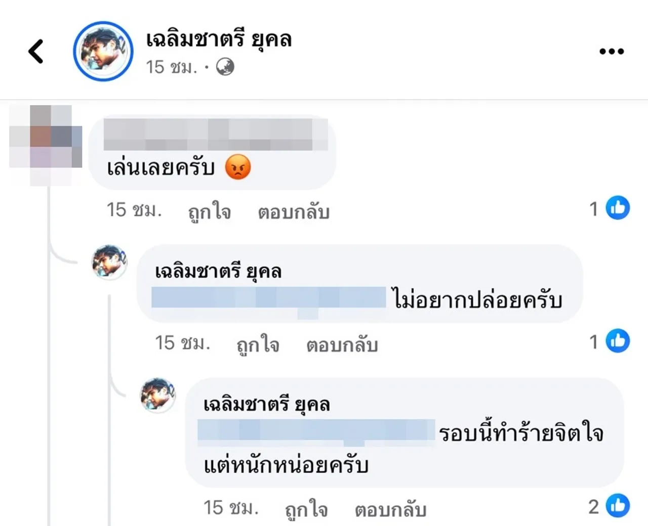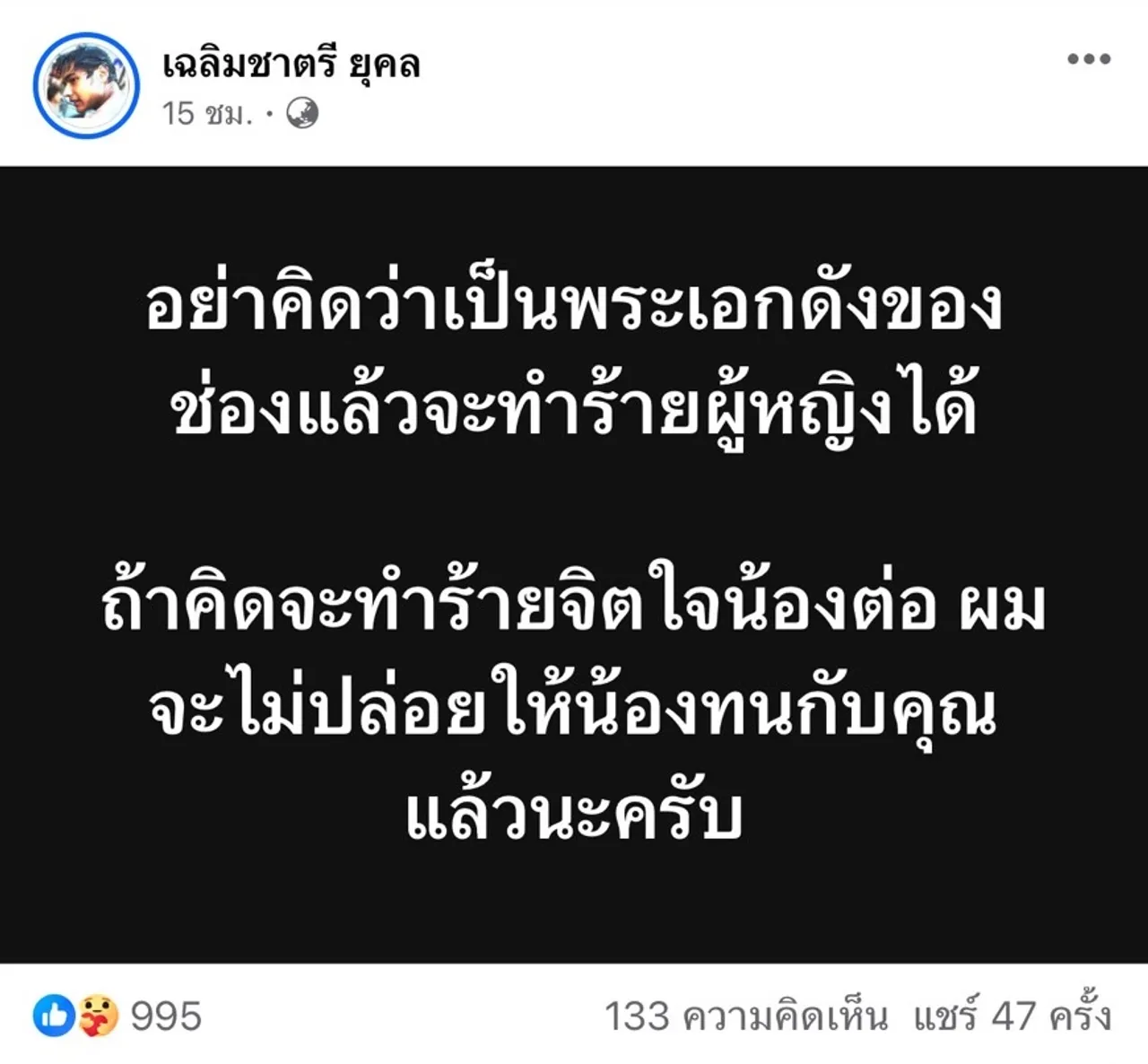โดยในเฟซบุ๊ก เฉลิมชาตรี ยุคล (Adam) ได้โพสต์ข้อความว่า “อย่าคิดว่าเป็นพระเอกดังของช่องแล้วจะทำร้ายผู้หญิงได้ ถ้าคิดจะทำร้ายจิตใจน้องต่อ ผมจะไม่ปล่อยให้น้องทนกับคุณแล้วนะครับ”