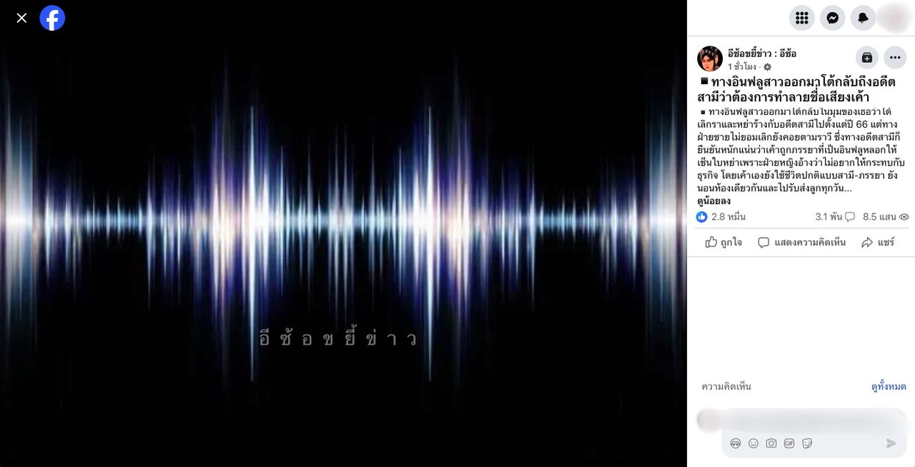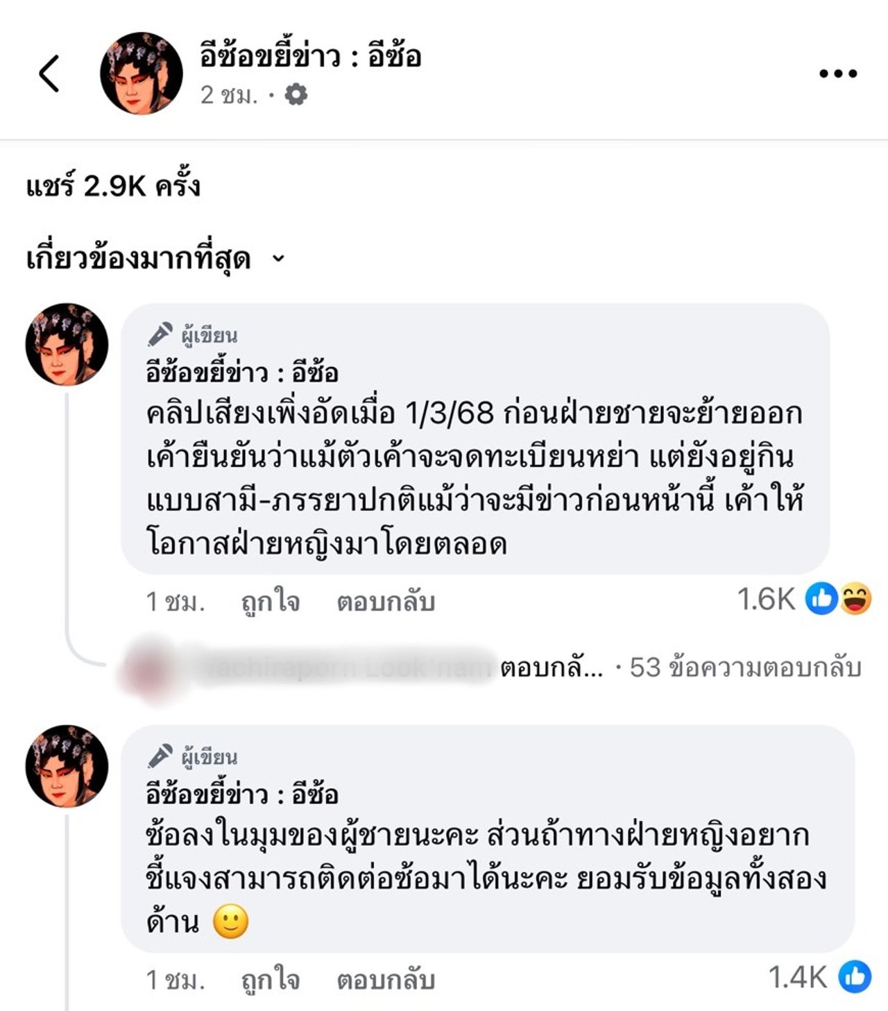 หลังจากนั้นเพจอีซ้อฯ ก็คอมเมนต์ใต้คลิปเพิ่มเติมว่า “คลิปเสียงเพิ่งอัดเมื่อ 1/3/68 ก่อนฝ่ายชายจะย้ายออก เค้ายืนยันว่าแม้ตัวเค้าจะจดทะเบียนหย่า แต่ยังอยู่กินแบบสามี-ภรรยาปกติแม้ว่าจะมีข่าวก่อนหน้านี้ เค้าให้โอกาสฝ่ายหญิงมาโดยตลอด” รวมถึงข้อความ "ซ้อลงในมุมของผู้ชายนะคะ ส่วนถ้าทางฝ่ายหญิงอยากชี้แจงสามารถติดต่อซ้อมาได้นะคะ ยอมรับข้อมูลทั้งสองด้าน" โดยมีชาวเน็ตแสดงความคิดเห็นเป็นจำนวนมาก