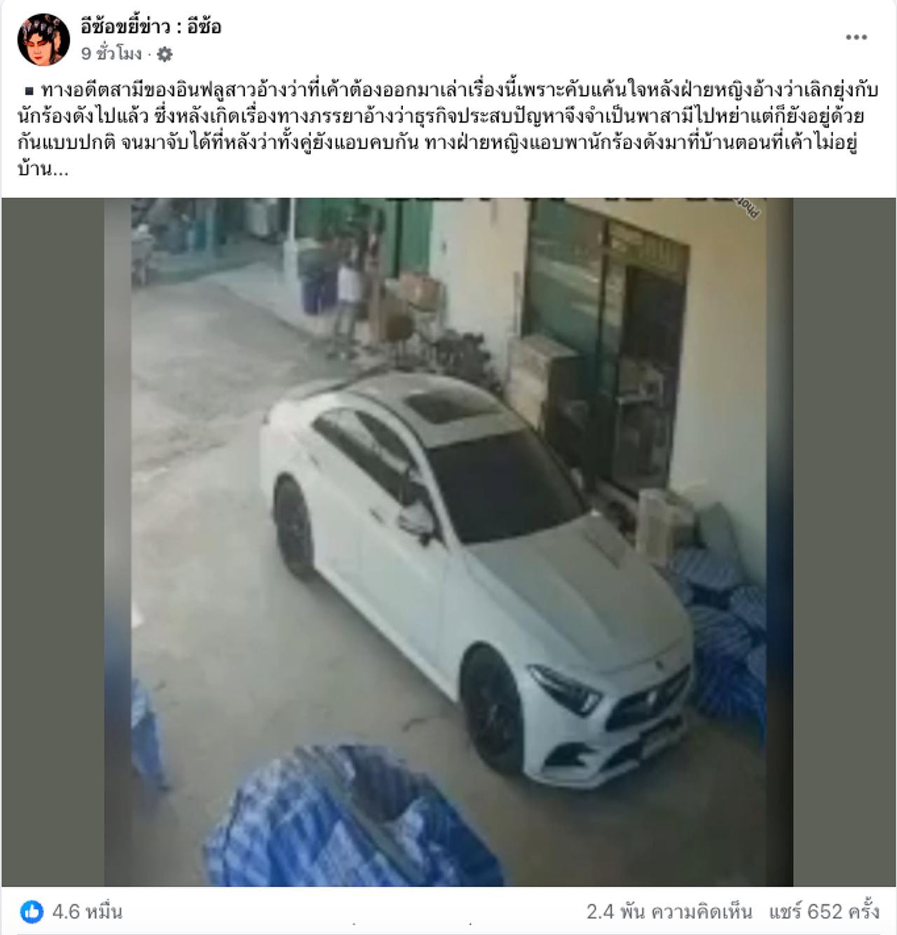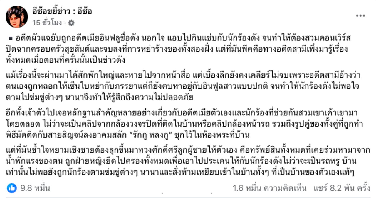 เปิดประเด็นร้อนฉ่าวงการบันเทิงอีกแล้ว สำหรับเพจ อีซ้อขยี้ข่าว : อีซ้อ ที่โพสต์เล่าว่าอดีตสามีแฉอดีตภรรยาอินฟลูเอนเซอร์สาวกับนักร้องดัง ซึ่งอดีตสามีเพิ่งรู้เรื่องตอนเป็นข่าวดัง เบื้องหลังก็ยังเคลียร์ไม่จบเพราะอดีตสามีอ้างว่าตนถูกหลอกให้เซ็นใบหย่า แต่ก็ยังคบกันปกติ แต่นักร้องดังไม่พอใจ ตามไปข่มขู่