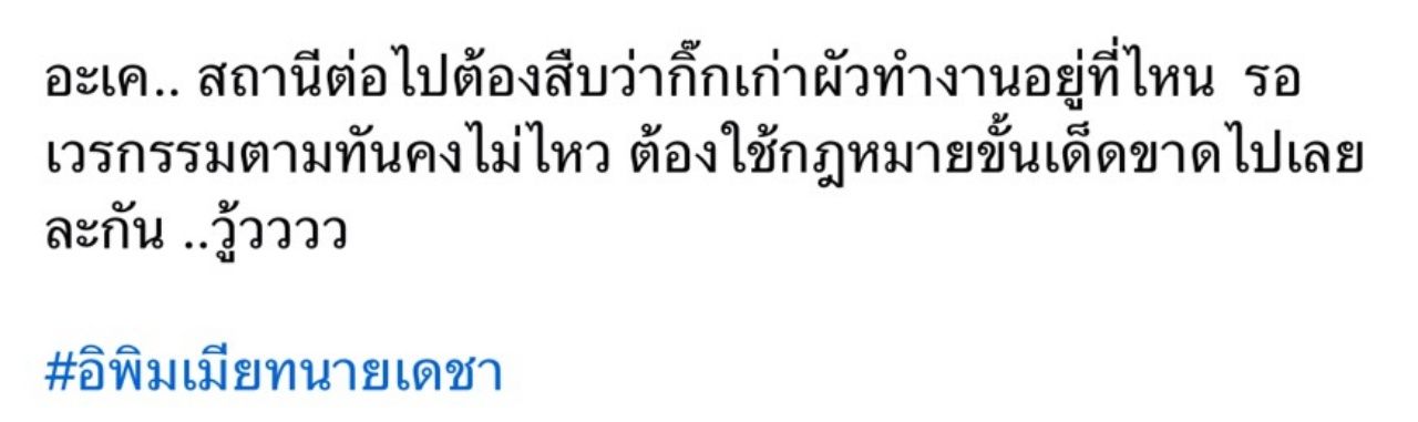 โอเค... สถานีต่อไปต้องสืบว่ากิ๊กเก่าผัวทำงานอยู่ที่ไหน รอเวรกรรมตามทันคงไม่ไหว ต้องใช้กฎหมายขั้นเด็ดขาดไปเลยละกัน... วู้ววว"