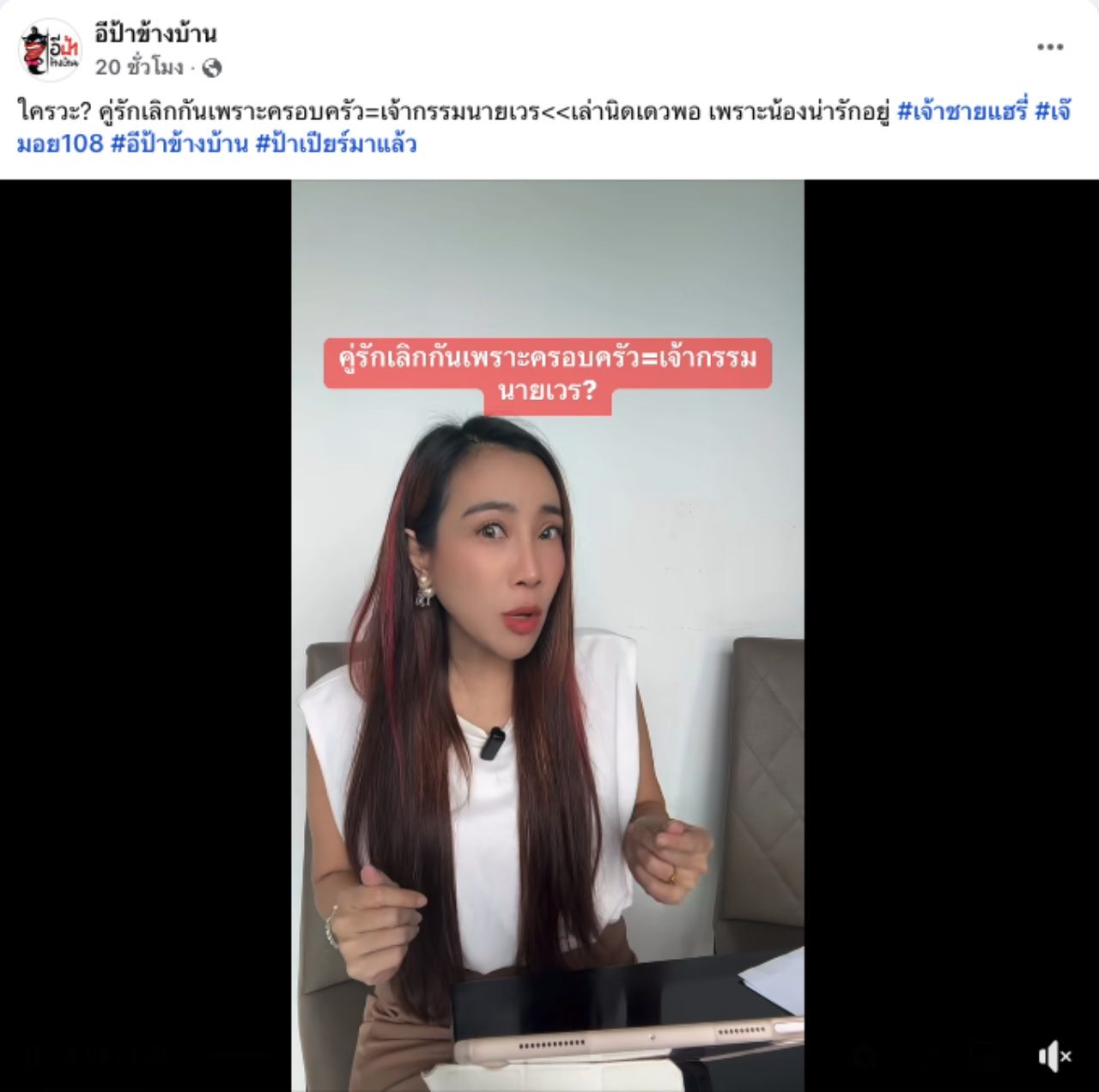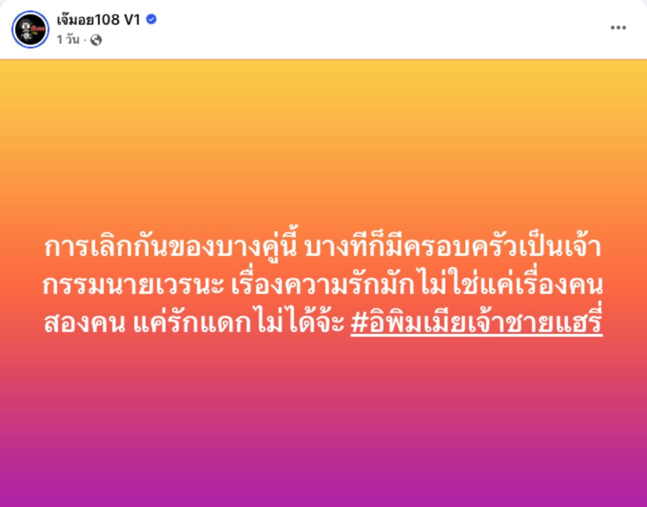 ช่วงนี้คนดังในวงการบันเทิงได้เลิกรากันหลายคู่ และก่อนหน้านี้เพจดังอย่าง เจ๊มอย108 V1 ก็ได้โพสต์ข้อความปริศนาถึงการเลิกราคู่รักคนดังคู่หนึ่ง บอกว่า "การเลิกกันของบางคู่นี้ บางทีก็มีครอบครัวเป็นเจ้ากรรมนายเวรนะ เรื่องความรักมักไม่ใช่แค่เรื่องคนสองคน แค่รักแดXไม่ได้จ้ะ #อิพิมเมียเจ้าชายแฮรี่"