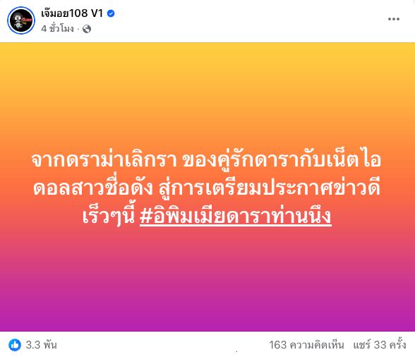 ทำเอาชาวเน็ตขาเผือกอยากรู้ขึ้นมาทันที เมื่อเพจบันเทิงดัง เจ๊มอย 108 โพสต์ข้อความเม้าท์ถึงคู่รักคู่หนึ่งที่เป็นดาราและเน็ตไอดอลไว้ว่า “จากดราม่าเลิกรา ของคู่รักดารากับเน็ตไอดอลสาวชื่อดัง สู่การเตรียมประกาศข่าวดีเร็วๆ นี้ #อิพิมเมียดาราท่านนึง”