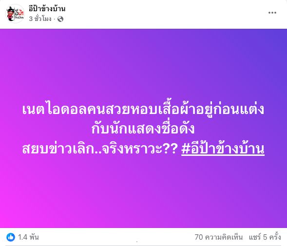 หลังจากนั้นเพจ อีป้าข้างบ้าน ก็โพสต์ข้อความเม้าท์บ้าง โดยบอกว่า “เน็ตไอดอลคนสวยหอบเสื้อผ้าอยู่ก่อนแต่งกับนักแสดงชื่อดัง สยบข่าวเลิก..จริงหราวะ?? #อีป้าข้างบ้าน”