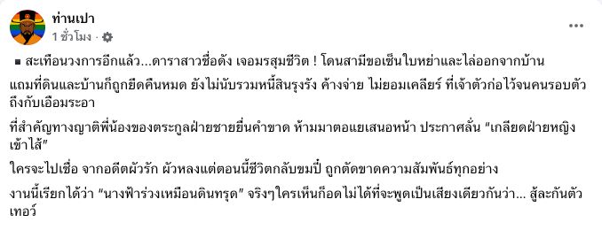 ทำเอาชาวเน็ตไม่ได้หลับไม่ได้นอนอีกแล้ว หลังเห็นโพสต์จากเพจ ท่านเปา ที่ได้โพสต์ถึงดาราสาวชื่อดัง โดนสามีขอเซ็นใบหย่า ไล่ออกจากบ้าน แถมที่ดินและบ้านถูกยึดคืนทั้งหมด เพราะเจ้าตัวค้างจ่าย จนคนรอบข้างเอือมระอา