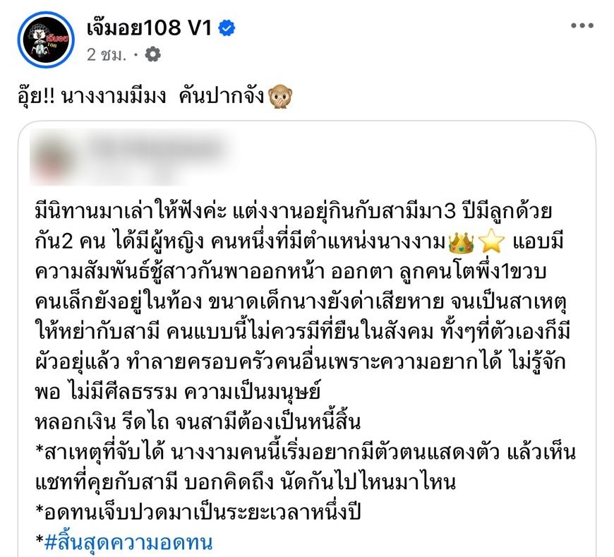กลายเป็นประเด็นให้ขาเผือกโซเชียลมีเรื่องให้พร้อมใส่ใจอีกแล้ว เมื่อเพจบันเทิงดัง เจ๊มอย108 V1 แชร์โพสต์ของสาวรายหนึ่งที่ออกโรงแฉถูกนางงามคนหนึ่งแย่งสามีไป ทั้งๆ ที่สามีและตนแต่งงานมีลูกด้วยกัน 2 คน ตอนนั้นคนโตอายุแค่ 1 ขวบ คนเล็กยังอยู่ในท้อง จนเป็นเหตุให้ต้องหย่า พร้อมทั้งเขียนแคปชั่น “อุ๊ย!! นางงามมีมง คันปากจัง”