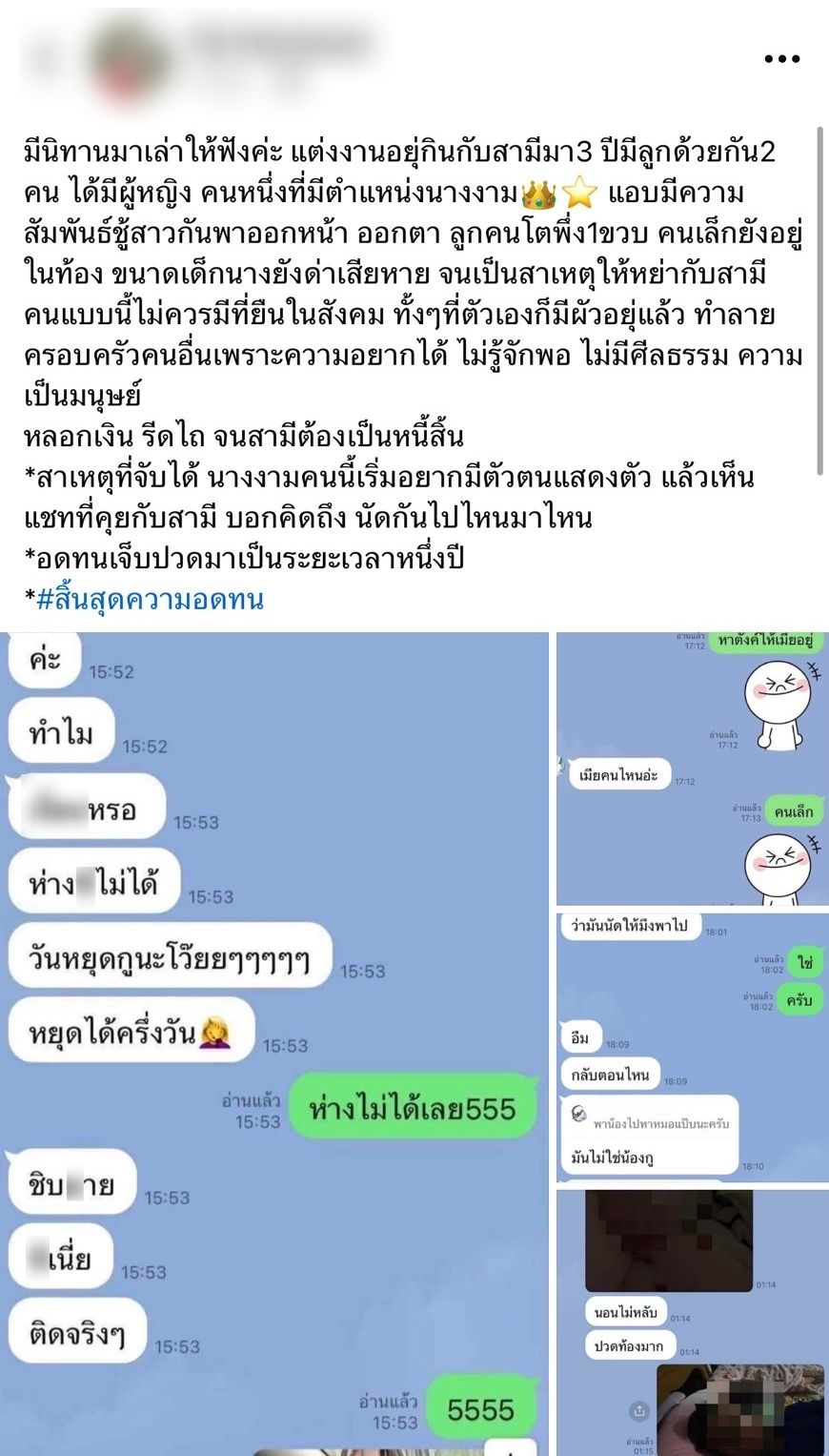 ลูกคนโตพึ่ง 1 ขวบ คนเล็กยังอยู่ในท้อง ขนาดเด็กนางยังด่าเสียหาย จนเป็นสาเหตุให้หย่ากับสามี คนแบบนี้ไม่ควรมีที่ยืนในสังคม ทั้งๆ ที่ตัวเองก็มีผัวอยู่แล้ว ทำลายครอบครัวคนอื่นเพราะความอยากได้ ไม่รู้จักพอ ไม่มีศีลธรรม ความเป็นมนุษย์ หลอกเงิน รีดไถ จนสามีต้องเป็นหนี้สิ้น