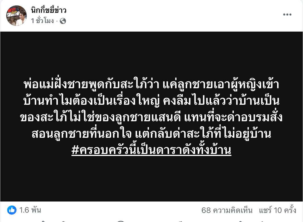 และ "พ่อแม่ฝั่งชายพูดกับสะใภ้ว่า แค่ลูกชายเอาผู้หญิงเข้าบ้านทำไมต้องเป็นเรื่องใหญ่ คงลืมไปแล้วว่าบ้านเป็นของสะใภ้ไม่ใช่ของลูกชายแสนดี แทนที่จะด่าอบรมสั่งสอนลูกชายที่นอกใจ แต่กลับด่าสะใภ้ที่ไม่อยู่บ้าน #ครอบครัวนี้เป็นดาราดังทั้งบ้าน"