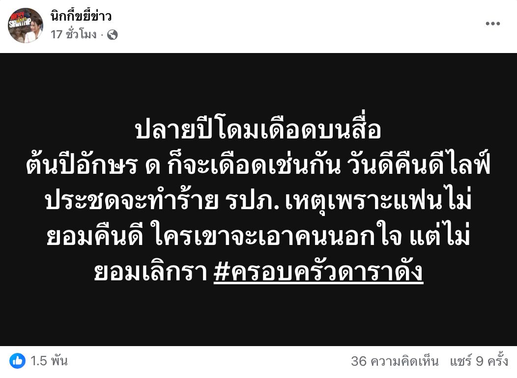 "ปลายปีโดมเดือดบนสื่อ ต้นปีอักษร ด ก็จะเดือดเช่นกัน วันดีคืนดีไลฟ์ประชดจะทำร้าย รปภ. เหตุเพราะแฟนไม่ยอมคืนดี ใครเขาจะเอาคนนอกใจ แต่ไม่ยอมเลิกรา #ครอบครัวดาราดัง"