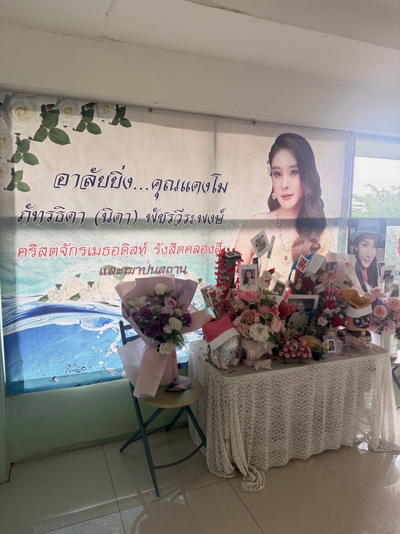 บรรยากาศ พิธีรำลึกวันครบรอบ 4 ปีการจากไปของ แตงโม นิดา ณ คริสตจักรเมธอดิสท์ รังสิต คลอง 4 เต็มไปด้วยความคิดถึงและความอบอุ่น โดยมีนักแสดงสาว โม อมีนา พร้อมกลุ่มเพื่อนสนิท เดินทางมาร่วมทำบุญวันครบรอบเป็นประจำทุกปี ภายในงานมีการร้องเพลงนมัสการพระเจ้าตามพิธีของศาสนาคริสต์อย่างเรียบง่ายและอบอุ่น